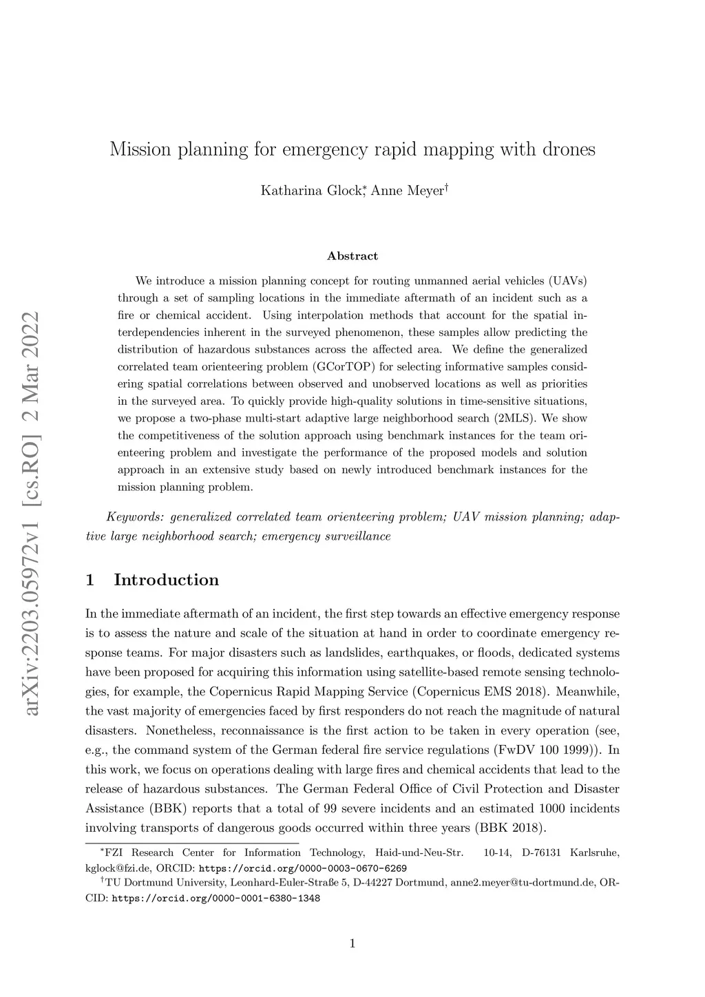 We introduce a mission planning concept for routing unmanned aerial vehicles (UAVs) through a set of sampling locations in the immediate aftermath of an incident such as a fire or chemical accident. Using interpolation methods that account for the spatial interdependencies inherent in the surveyed phenomenon, these samples allow predicting the distribution of hazardous substances across the affected area. We define the generalized correlated team orienteering problem (GCorTOP) for selecting {informative} samples considering spatial correlations between observed and unobserved locations as well as priorities in the surveyed area. To quickly provide high-quality solutions in time-sensitive situations, we propose a two-phase multi-start adaptive large neighborhood search (2MLS). We show the competitiveness of the solution approach using benchmark instances for the team orienteering problem and investigate the performance of the proposed models and solution approach in an extensive study based on newly introduced benchmark instances for the mission planning problem.