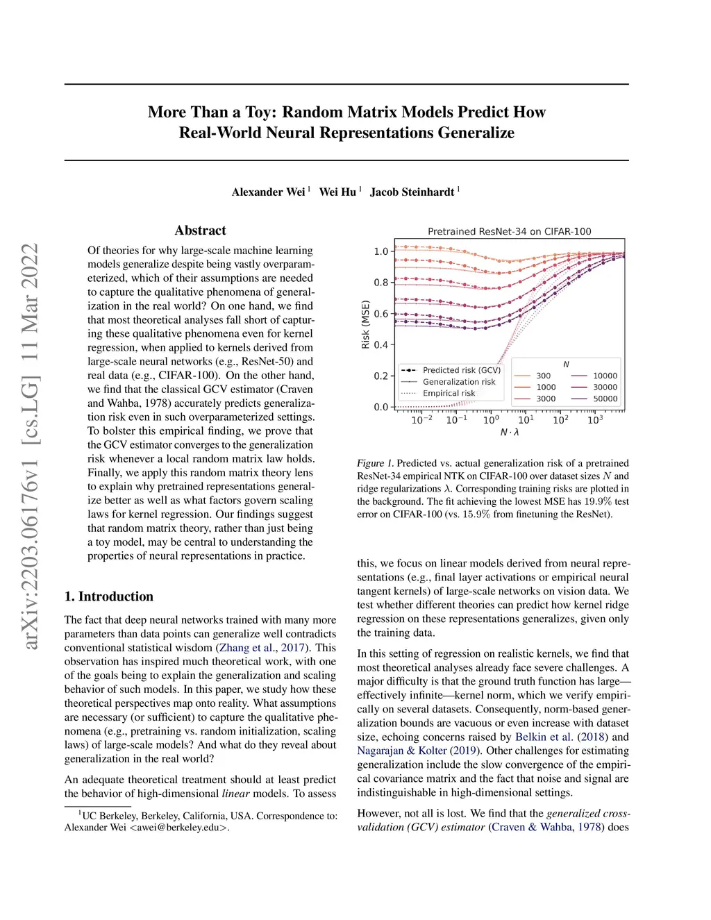 Of theories for why large-scale machine learning models generalize despite being vastly overparameterized, which of their assumptions are needed to capture the qualitative phenomena of generalization in the real world? On one hand, we find that most theoretical analyses fall short of capturing these qualitative phenomena even for kernel regression, when applied to kernels derived from large-scale neural networks (e.g., ResNet-50) and real data (e.g., CIFAR-100). On the other hand, we find that the classical GCV estimator (Craven and Wahba, 1978) accurately predicts generalization risk even in such overparameterized settings. To bolster this empirical finding, we prove that the GCV estimator converges to the generalization risk whenever a local random matrix law holds. Finally, we apply this random matrix theory lens to explain why pretrained representations generalize better as well as what factors govern scaling laws for kernel regression. Our findings suggest that random matrix theory, rather than just being a toy model, may be central to understanding the properties of neural representations in practice.