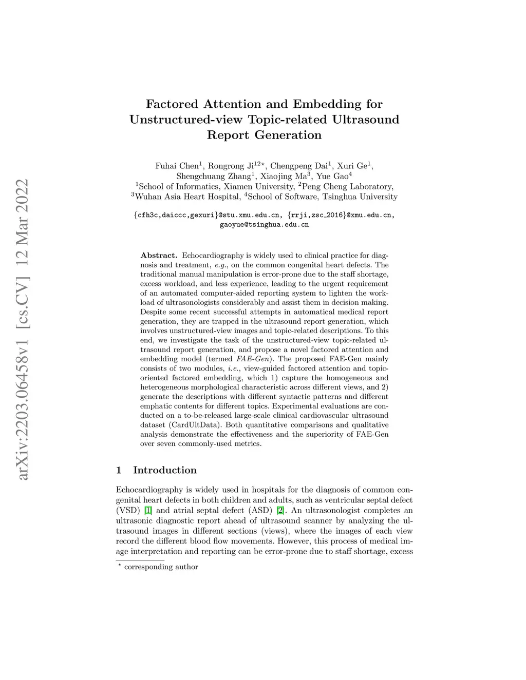Echocardiography is widely used to clinical practice for diagnosis and treatment, e.g., on the common congenital heart defects. The traditional manual manipulation is error-prone due to the staff shortage, excess workload, and less experience, leading to the urgent requirement of an automated computer-aided reporting system to lighten the workload of ultrasonologists considerably and assist them in decision making. Despite some recent successful attempts in automatical medical report generation, they are trapped in the ultrasound report generation, which involves unstructured-view images and topic-related descriptions. To this end, we investigate the task of the unstructured-view topic-related ultrasound report generation, and propose a novel factored attention and embedding model (termed FAE-Gen). The proposed FAE-Gen mainly consists of two modules, i.e., view-guided factored attention and topic-oriented factored embedding, which 1) capture the homogeneous and heterogeneous morphological characteristic across different views, and 2) generate the descriptions with different syntactic patterns and different emphatic contents for different topics. Experimental evaluations are conducted on a to-be-released large-scale clinical cardiovascular ultrasound dataset (CardUltData). Both quantitative comparisons and qualitative analysis demonstrate the effectiveness and the superiority of FAE-Gen over seven commonly-used metrics.