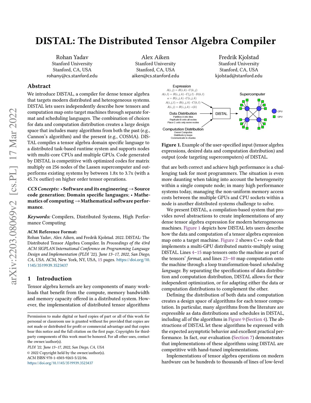 We introduce DISTAL, a compiler for dense tensor algebra that targets modern distributed and heterogeneous systems. DISTAL lets users independently describe how tensors and computation map onto target machines through separate format and scheduling languages. The combination of choices for data and computation distribution creates a large design space that includes many algorithms from both the past (e.g., Cannon's algorithm) and the present (e.g., COSMA). DISTAL compiles a tensor algebra domain specific language to a distributed task-based runtime system and supports nodes with multi-core CPUs and multiple GPUs. Code generated by DISTAL is competitive with optimized codes for matrix multiply on 256 nodes of the Lassen supercomputer and outperforms existing systems by between 1.8x to 3.7x (with a 45.7x outlier) on higher order tensor operations.