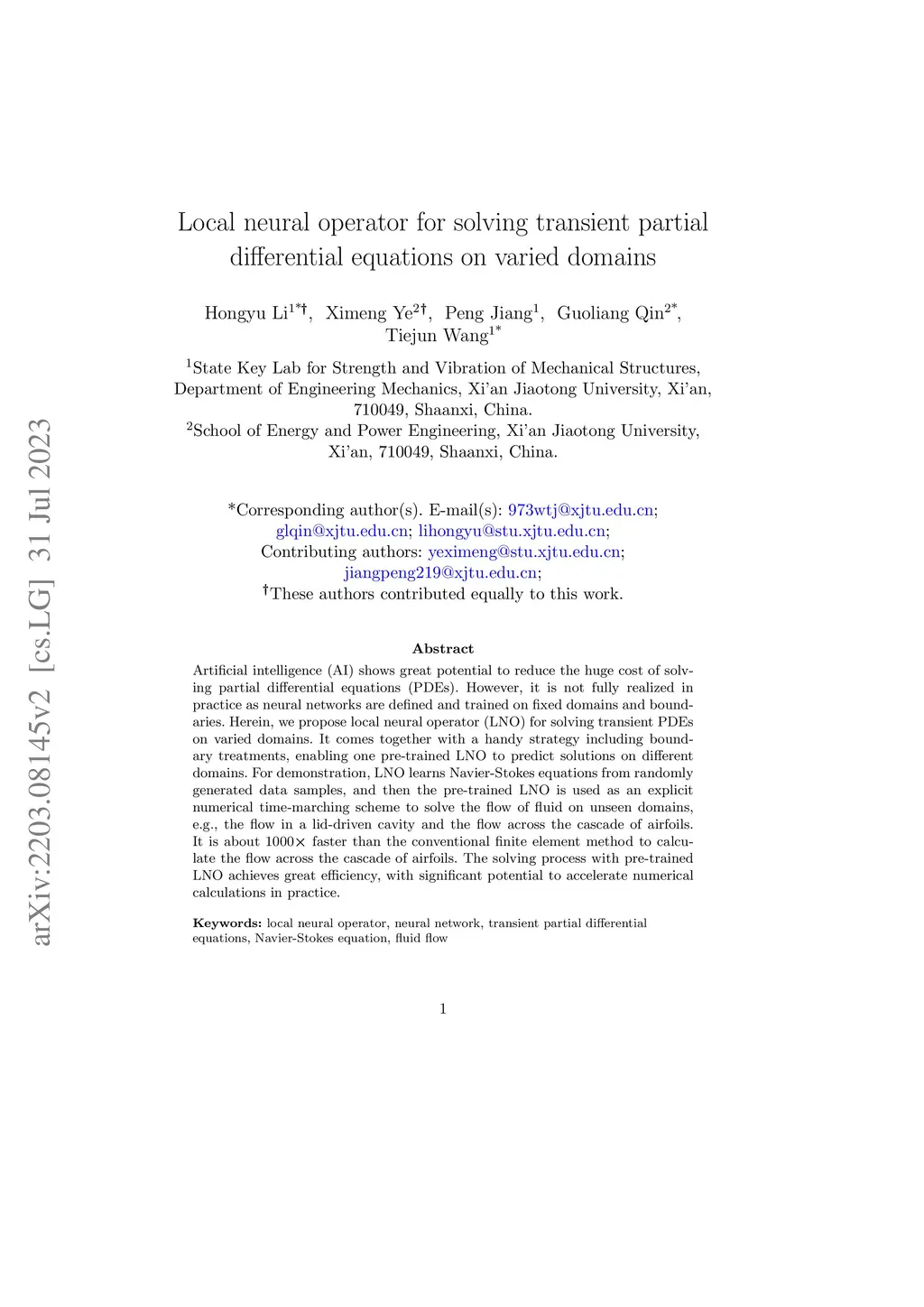 Artificial intelligence (AI) shows great potential to reduce the huge cost of solving partial differential equations (PDEs). However, it is not fully realized in practice as neural networks are defined and trained on fixed domains and boundaries. Herein, we propose local neural operator (LNO) for solving transient PDEs on varied domains. It comes together with a handy strategy including boundary treatments, enabling one pre-trained LNO to predict solutions on different domains. For demonstration, LNO learns Navier-Stokes equations from randomly generated data samples, and then the pre-trained LNO is used as an explicit numerical time-marching scheme to solve the flow of fluid on unseen domains, e.g., the flow in a lid-driven cavity and the flow across the cascade of airfoils. It is about 1000 faster than the conventional finite element method to calculate the flow across the cascade of airfoils. The solving process with pre-trained LNO achieves great efficiency, with significant potential to accelerate numerical calculations in practice.