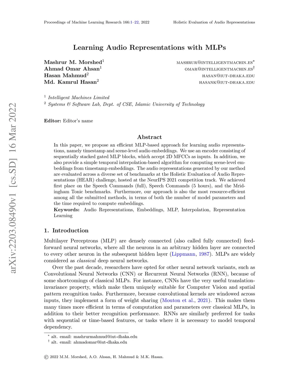 In this paper, we propose an efficient MLP-based approach for learning audio representations, namely timestamp and scene-level audio embeddings. We use an encoder consisting of sequentially stacked gated MLP blocks, which accept 2D MFCCs as inputs. In addition, we also provide a simple temporal interpolation-based algorithm for computing scene-level embeddings from timestamp embeddings. The audio representations generated by our method are evaluated across a diverse set of benchmarks at the Holistic Evaluation of Audio Representations (HEAR) challenge, hosted at the NeurIPS 2021 competition track. We achieved first place on the Speech Commands (full), Speech Commands (5 hours), and the Mridingham Tonic benchmarks. Furthermore, our approach is also the most resource-efficient among all the submitted methods, in terms of both the number of model parameters and the time required to compute embeddings.