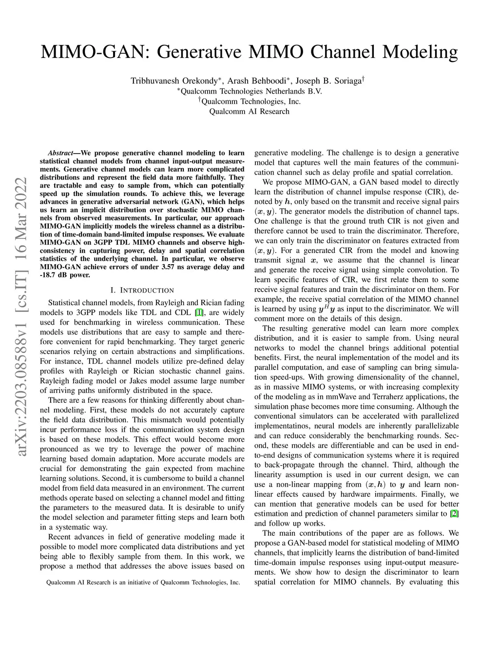 We propose generative channel modeling to learn statistical channel models from channel input-output measurements. Generative channel models can learn more complicated distributions and represent the field data more faithfully. They are tractable and easy to sample from, which can potentially speed up the simulation rounds. To achieve this, we leverage advances in GAN, which helps us learn an implicit distribution over stochastic MIMO channels from observed measurements. In particular, our approach MIMO-GAN implicitly models the wireless channel as a distribution of time-domain band-limited impulse responses. We evaluate MIMO-GAN on 3GPP TDL MIMO channels and observe high-consistency in capturing power, delay and spatial correlation statistics of the underlying channel. In particular, we observe MIMO-GAN achieve errors of under 3.57 ns average delay and -18.7 dB power.