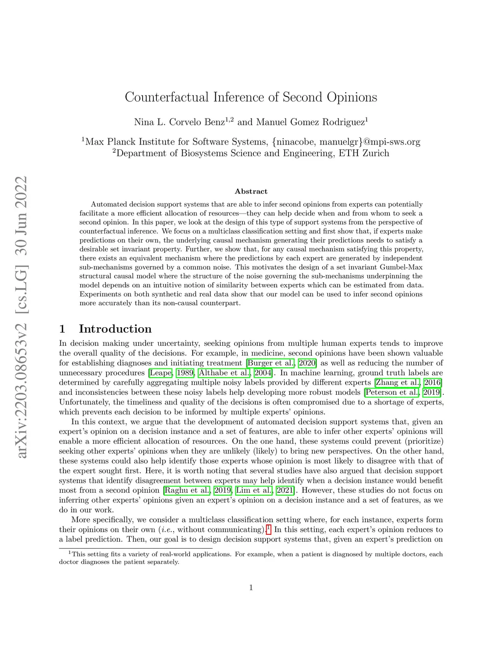 Automated decision support systems that are able to infer second opinions from experts can potentially facilitate a more efficient allocation of resources; they can help decide when and from whom to seek a second opinion. In this paper, we look at the design of this type of support systems from the perspective of counterfactual inference. We focus on a multiclass classification setting and first show that, if experts make predictions on their own, the underlying causal mechanism generating their predictions needs to satisfy a desirable set invariant property. Further, we show that, for any causal mechanism satisfying this property, there exists an equivalent mechanism where the predictions by each expert are generated by independent sub-mechanisms governed by a common noise. This motivates the design of a set invariant Gumbel-Max structural causal model where the structure of the noise governing the sub-mechanisms underpinning the model depends on an intuitive notion of similarity between experts which can be estimated from data. Experiments on both synthetic and real data show that our model can be used to infer second opinions more accurately than its non-causal counterpart.