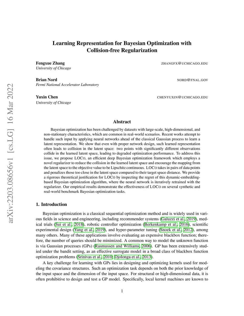 Bayesian optimization has been challenged by datasets with large-scale, high-dimensional, and non-stationary characteristics, which are common in real-world scenarios. Recent works attempt to handle such input by applying neural networks ahead of the classical Gaussian process to learn a latent representation. We show that even with proper network design, such learned representation often leads to collision in the latent space: two points with significantly different observations collide in the learned latent space, leading to degraded optimization performance. To address this issue, we propose LOCo, an efficient deep Bayesian optimization framework which employs a novel regularizer to reduce the collision in the learned latent space and encourage the mapping from the latent space to the objective value to be Lipschitz continuous. LOCo takes in pairs of data points and penalizes those too close in the latent space compared to their target space distance. We provide a rigorous theoretical justification for LOCo by inspecting the regret of this dynamic-embedding-based Bayesian optimization algorithm, where the neural network is iteratively retrained with the regularizer. Our empirical results demonstrate the effectiveness of LOCo on several synthetic and real-world benchmark Bayesian optimization tasks.