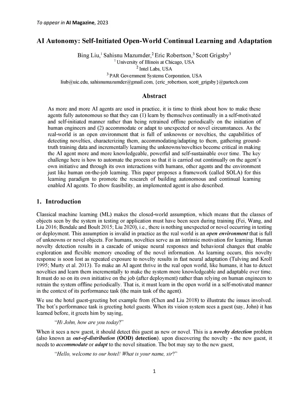 As more and more AI agents are used in practice, it is time to think about how to make these agents fully autonomous so that they can (1) learn by themselves continually in a self-motivated and self-initiated manner rather than being retrained offline periodically on the initiation of human engineers and (2) accommodate or adapt to unexpected or novel circumstances. As the real-world is an open environment that is full of unknowns or novelties, the capabilities of detecting novelties, characterizing them, accommodating/adapting to them, gathering ground-truth training data and incrementally learning the unknowns/novelties become critical in making the AI agent more and more knowledgeable, powerful and self-sustainable over time. The key challenge here is how to automate the process so that it is carried out continually on the agent's own initiative and through its own interactions with humans, other agents and the environment just like human on-the-job learning. This paper proposes a framework (called SOLA) for this learning paradigm to promote the research of building autonomous and continual learning enabled AI agents. To show feasibility, an implemented agent is also described.