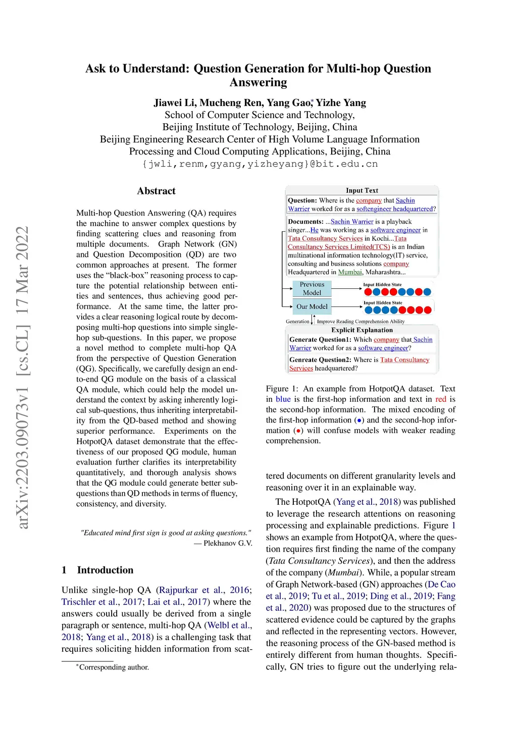 Multi-hop Question Answering (QA) requires the machine to answer complex questions by finding scattering clues and reasoning from multiple documents. Graph Network (GN) and Question Decomposition (QD) are two common approaches at present. The former uses the "black-box" reasoning process to capture the potential relationship between entities and sentences, thus achieving good performance. At the same time, the latter provides a clear reasoning logical route by decomposing multi-hop questions into simple single-hop sub-questions. In this paper, we propose a novel method to complete multi-hop QA from the perspective of Question Generation (QG). Specifically, we carefully design an end-to-end QG module on the basis of a classical QA module, which could help the model understand the context by asking inherently logical sub-questions, thus inheriting interpretability from the QD-based method and showing superior performance. Experiments on the HotpotQA dataset demonstrate that the effectiveness of our proposed QG module, human evaluation further clarifies its interpretability quantitatively, and thorough analysis shows that the QG module could generate better sub-questions than QD methods in terms of fluency, consistency, and diversity.