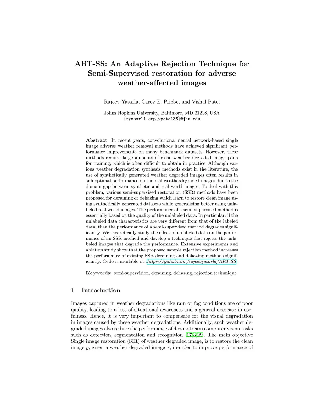 In recent years, convolutional neural network-based single image adverse weather removal methods have achieved significant performance improvements on many benchmark datasets. However, these methods require large amounts of clean-weather degraded image pairs for training, which is often difficult to obtain in practice. Although various weather degradation synthesis methods exist in the literature, the use of synthetically generated weather degraded images often results in sub-optimal performance on the real weather degraded images due to the domain gap between synthetic and real-world images. To deal with this problem, various semi-supervised restoration (SSR) methods have been proposed for deraining or dehazing which learn to restore the clean image using synthetically generated datasets while generalizing better using unlabeled real-world images. The performance of a semi-supervised method is essentially based on the quality of the unlabeled data. In particular, if the unlabeled data characteristics are very different from that of the labeled data, then the performance of a semi-supervised method degrades significantly. We theoretically study the effect of unlabeled data on the performance of an SSR method and develop a technique that rejects the unlabeled images that degrade the performance. Extensive experiments and ablation study show that the proposed sample rejection method increases the performance of existing SSR deraining and dehazing methods significantly. Code is available at :https://github.com/rajeevyasarla/ART-SS