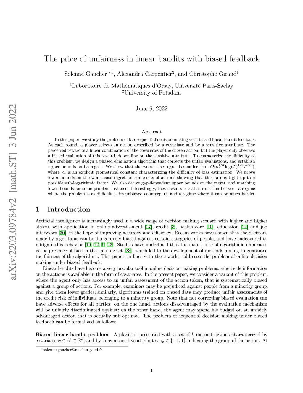In this paper, we study the problem of fair sequential decision making with biased linear bandit feedback. At each round, a player selects an action described by a covariate and by a sensitive attribute. The perceived reward is a linear combination of the covariates of the chosen action, but the player only observes a biased evaluation of this reward, depending on the sensitive attribute. To characterize the difficulty of this problem, we design a phased elimination algorithm that corrects the unfair evaluations, and establish upper bounds on its regret. We show that the worst-case regret is smaller than , where is an explicit geometrical constant characterizing the difficulty of bias estimation. We prove lower bounds on the worst-case regret for some sets of actions showing that this rate is tight up to a possible sub-logarithmic factor. We also derive gap-dependent upper bounds on the regret, and matching lower bounds for some problem instance.Interestingly, these results reveal a transition between a regime where the problem is as difficult as its unbiased counterpart, and a regime where it can be much harder.