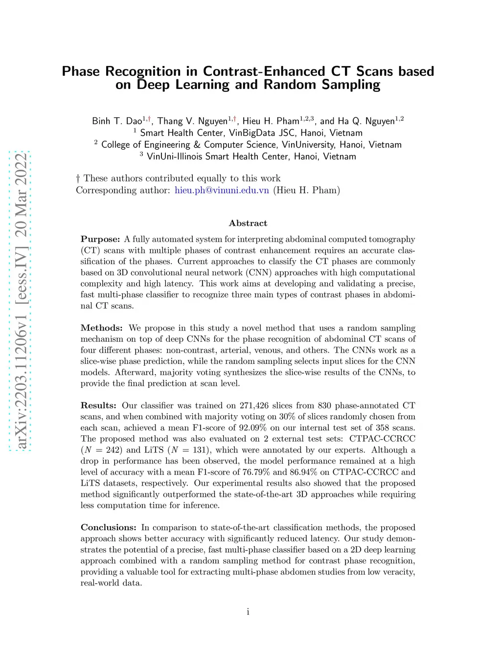 A fully automated system for interpreting abdominal computed tomography (CT) scans with multiple phases of contrast enhancement requires an accurate classification of the phases. This work aims at developing and validating a precise, fast multi-phase classifier to recognize three main types of contrast phases in abdominal CT scans. We propose in this study a novel method that uses a random sampling mechanism on top of deep CNNs for the phase recognition of abdominal CT scans of four different phases: non-contrast, arterial, venous, and others. The CNNs work as a slice-wise phase prediction, while the random sampling selects input slices for the CNN models. Afterward, majority voting synthesizes the slice-wise results of the CNNs, to provide the final prediction at scan level. Our classifier was trained on 271,426 slices from 830 phase-annotated CT scans, and when combined with majority voting on 30% of slices randomly chosen from each scan, achieved a mean F1-score of 92.09% on our internal test set of 358 scans. The proposed method was also evaluated on 2 external test sets: CTPAC-CCRCC (N = 242) and LiTS (N = 131), which were annotated by our experts. Although a drop in performance has been observed, the model performance remained at a high level of accuracy with a mean F1-score of 76.79% and 86.94% on CTPAC-CCRCC and LiTS datasets, respectively. Our experimental results also showed that the proposed method significantly outperformed the state-of-the-art 3D approaches while requiring less computation time for inference.