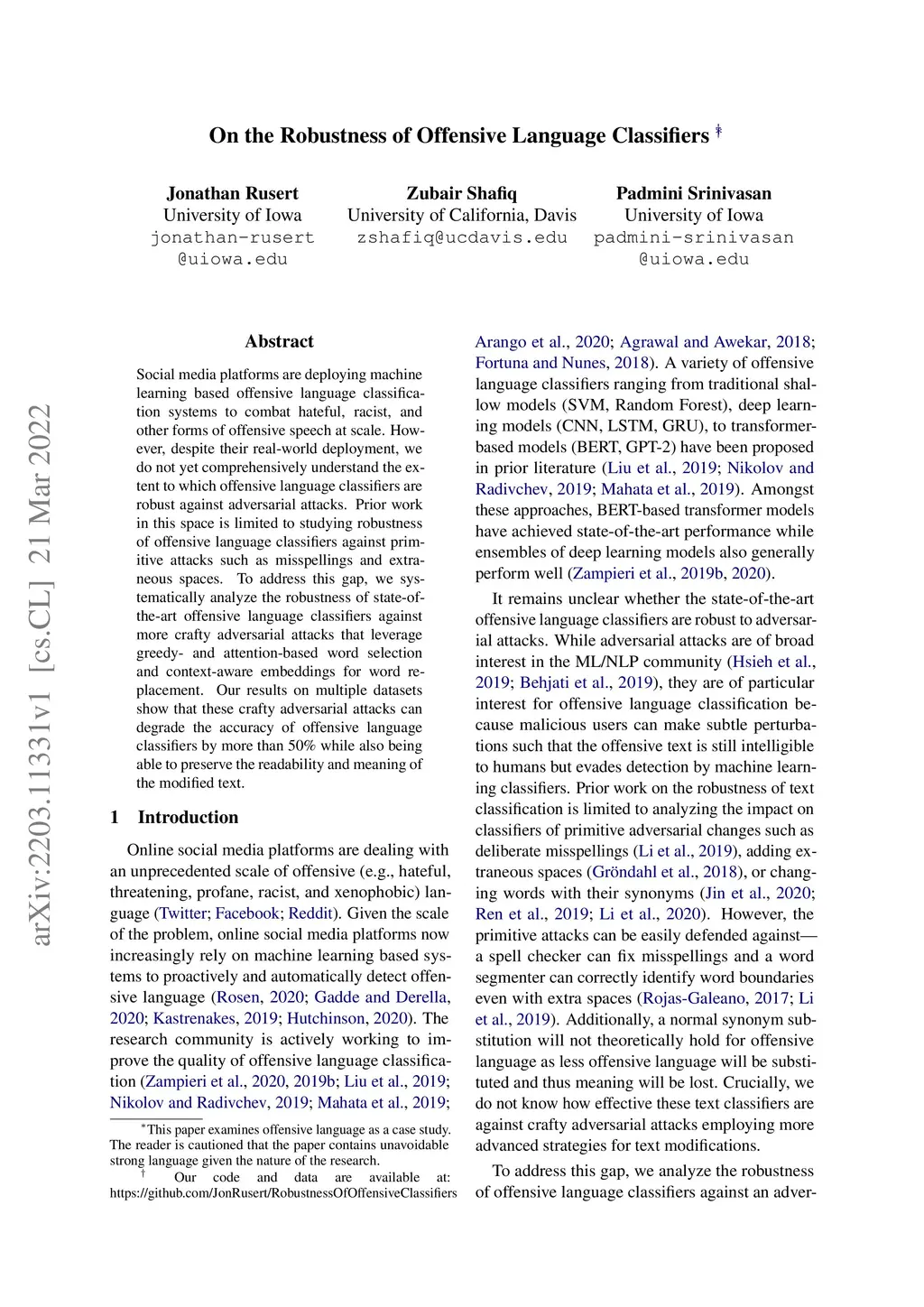 Social media platforms are deploying machine learning based offensive language classification systems to combat hateful, racist, and other forms of offensive speech at scale. However, despite their real-world deployment, we do not yet comprehensively understand the extent to which offensive language classifiers are robust against adversarial attacks. Prior work in this space is limited to studying robustness of offensive language classifiers against primitive attacks such as misspellings and extraneous spaces. To address this gap, we systematically analyze the robustness of state-of-the-art offensive language classifiers against more crafty adversarial attacks that leverage greedy- and attention-based word selection and context-aware embeddings for word replacement. Our results on multiple datasets show that these crafty adversarial attacks can degrade the accuracy of offensive language classifiers by more than 50% while also being able to preserve the readability and meaning of the modified text.