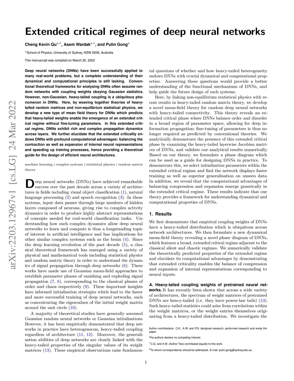 Deep neural networks (DNNs) have been successfully applied to many real-world problems, but a complete understanding of their dynamical and computational principles is still lacking. Conventional theoretical frameworks for analysing DNNs often assume random networks with coupling weights obeying Gaussian statistics. However, non-Gaussian, heavy-tailed coupling is a ubiquitous phenomenon in DNNs. Here, by weaving together theories of heavy-tailed random matrices and non-equilibrium statistical physics, we develop a new type of mean field theory for DNNs which predicts that heavy-tailed weights enable the emergence of an extended critical regime without fine-tuning parameters. In this extended critical regime, DNNs exhibit rich and complex propagation dynamics across layers. We further elucidate that the extended criticality endows DNNs with profound computational advantages: balancing the contraction as well as expansion of internal neural representations and speeding up training processes, hence providing a theoretical guide for the design of efficient neural architectures.