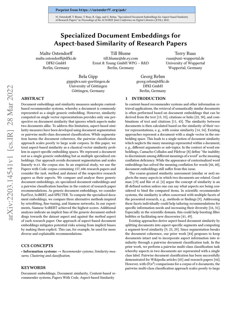 Document embeddings and similarity measures underpin content-based recommender systems, whereby a document is commonly represented as a single generic embedding. However, similarity computed on single vector representations provides only one perspective on document similarity that ignores which aspects make two documents alike. To address this limitation, aspect-based similarity measures have been developed using document segmentation or pairwise multi-class document classification. While segmentation harms the document coherence, the pairwise classification approach scales poorly to large scale corpora. In this paper, we treat aspect-based similarity as a classical vector similarity problem in aspect-specific embedding spaces. We represent a document not as a single generic embedding but as multiple specialized embeddings. Our approach avoids document segmentation and scales linearly w.r.t.the corpus size. In an empirical study, we use the Papers with Code corpus containing 157,606 research papers and consider the task, method, and dataset of the respective research papers as their aspects. We compare and analyze three generic document embeddings, six specialized document embeddings and a pairwise classification baseline in the context of research paper recommendations. As generic document embeddings, we consider FastText, SciBERT, and SPECTER. To compute the specialized document embeddings, we compare three alternative methods inspired by retrofitting, fine-tuning, and Siamese networks. In our experiments, Siamese SciBERT achieved the highest scores. Additional analyses indicate an implicit bias of the generic document embeddings towards the dataset aspect and against the method aspect of each research paper. Our approach of aspect-based document embeddings mitigates potential risks arising from implicit biases by making them explicit.