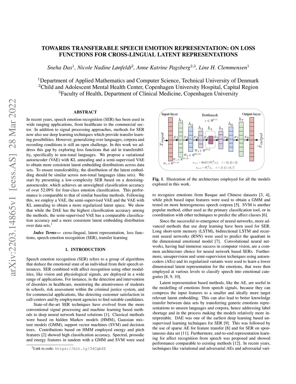 In recent years, speech emotion recognition (SER) has been used in wide ranging applications, from healthcare to the commercial sector. In addition to signal processing approaches, methods for SER now also use deep learning techniques which provide transfer learning possibilities. However, generalizing over languages, corpora and recording conditions is still an open challenge. In this work we address this gap by exploring loss functions that aid in transferability, specifically to non-tonal languages. We propose a variational autoencoder (VAE) with KL annealing and a semi-supervised VAE to obtain more consistent latent embedding distributions across data sets. To ensure transferability, the distribution of the latent embedding should be similar across non-tonal languages (data sets). We start by presenting a low-complexity SER based on a denoising-autoencoder, which achieves an unweighted classification accuracy of over 52.09% for four-class emotion classification. This performance is comparable to that of similar baseline methods. Following this, we employ a VAE, the semi-supervised VAE and the VAE with KL annealing to obtain a more regularized latent space. We show that while the DAE has the highest classification accuracy among the methods, the semi-supervised VAE has a comparable classification accuracy and a more consistent latent embedding distribution over data sets.