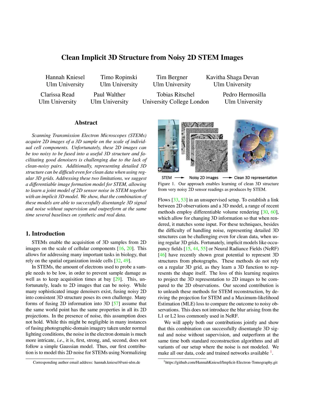 Scanning Transmission Electron Microscopes (STEMs) acquire 2D images of a 3D sample on the scale of individual cell components. Unfortunately, these 2D images can be too noisy to be fused into a useful 3D structure and facilitating good denoisers is challenging due to the lack of clean-noisy pairs. Additionally, representing a detailed 3D structure can be difficult even for clean data when using regular 3D grids. Addressing these two limitations, we suggest a differentiable image formation model for STEM, allowing to learn a joint model of 2D sensor noise in STEM together with an implicit 3D model. We show, that the combination of these models are able to successfully disentangle 3D signal and noise without supervision and outperform at the same time several baselines on synthetic and real data.