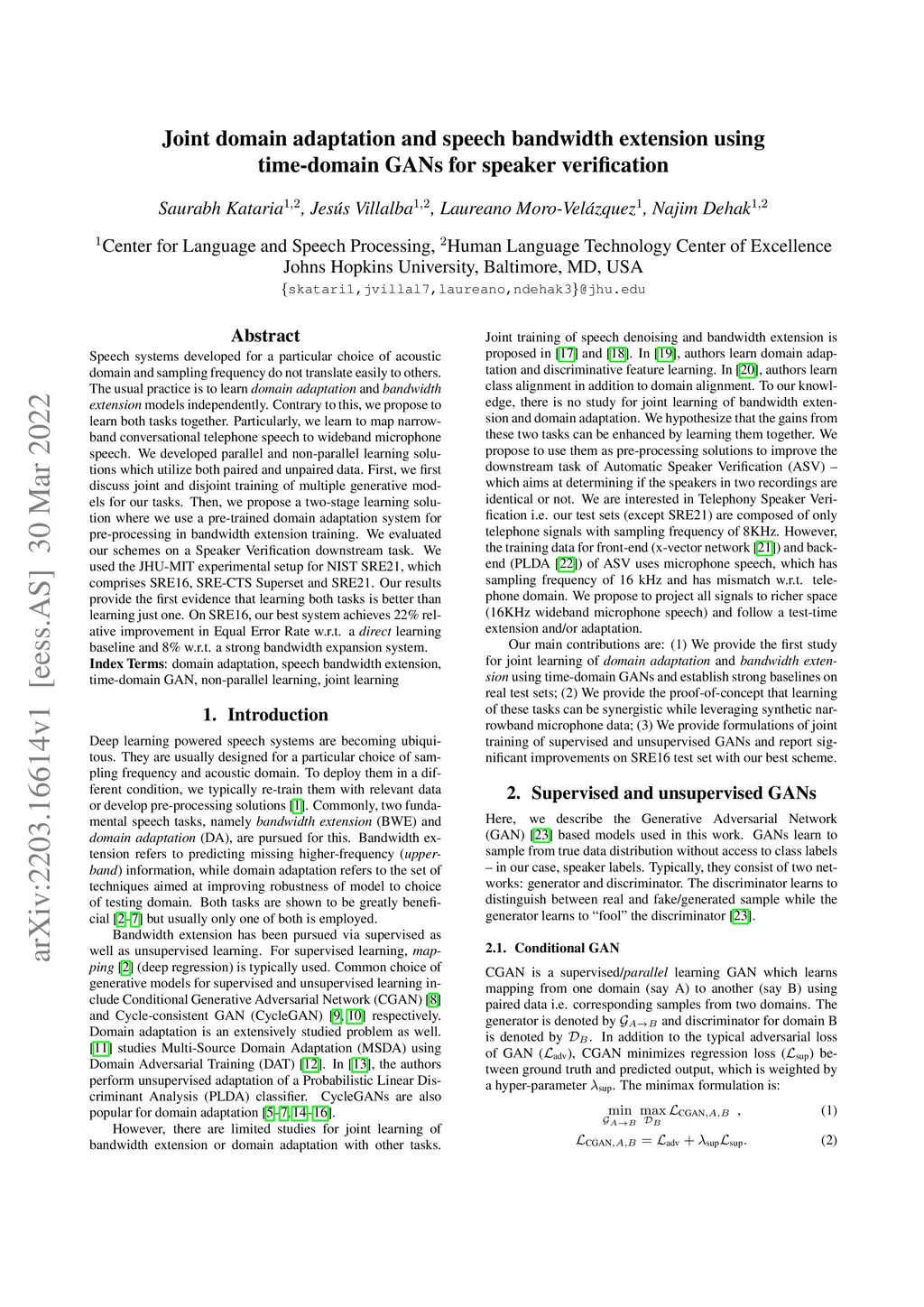 Speech systems developed for a particular choice of acoustic domain and sampling frequency do not translate easily to others. The usual practice is to learn domain adaptation and bandwidth extension models independently. Contrary to this, we propose to learn both tasks together. Particularly, we learn to map narrowband conversational telephone speech to wideband microphone speech. We developed parallel and non-parallel learning solutions which utilize both paired and unpaired data. First, we first discuss joint and disjoint training of multiple generative models for our tasks. Then, we propose a two-stage learning solution where we use a pre-trained domain adaptation system for pre-processing in bandwidth extension training. We evaluated our schemes on a Speaker Verification downstream task. We used the JHU-MIT experimental setup for NIST SRE21, which comprises SRE16, SRE-CTS Superset and SRE21. Our results provide the first evidence that learning both tasks is better than learning just one. On SRE16, our best system achieves 22% relative improvement in Equal Error Rate w.r.t. a direct learning baseline and 8% w.r.t. a strong bandwidth expansion system.