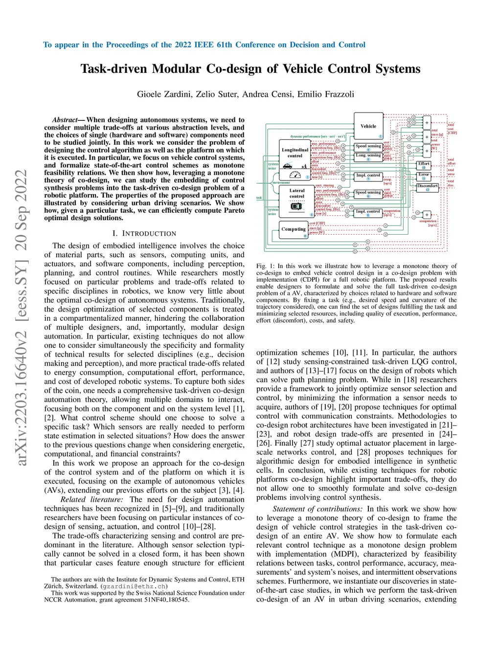 When designing autonomous systems, we need to consider multiple trade-offs at various abstraction levels, and the choices of single (hardware and software) components need to be studied jointly. In this work we consider the problem of designing the control algorithm as well as the platform on which it is executed. In particular, we focus on vehicle control systems, and formalize state-of-the-art control schemes as monotone feasibility relations. We then show how, leveraging a monotone theory of co-design, we can study the embedding of control synthesis problems into the task-driven co-design problem of a robotic platform. The properties of the proposed approach are illustrated by considering urban driving scenarios. We show how, given a particular task, we can efficiently compute Pareto optimal design solutions.