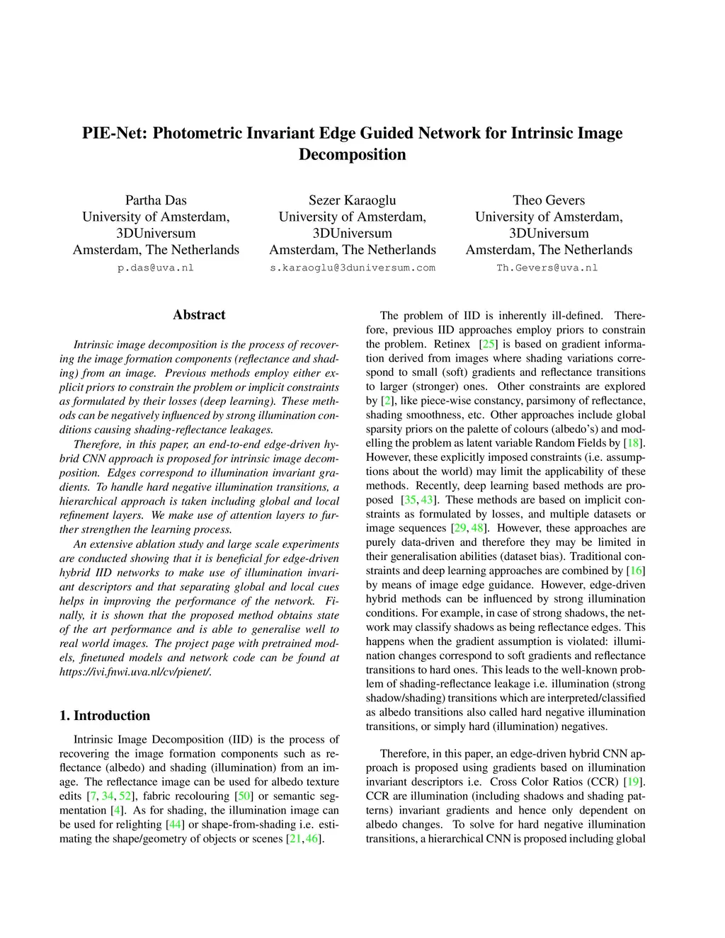 Intrinsic image decomposition is the process of recovering the image formation components (reflectance and shading) from an image. Previous methods employ either explicit priors to constrain the problem or implicit constraints as formulated by their losses (deep learning). These methods can be negatively influenced by strong illumination conditions causing shading-reflectance leakages. Therefore, in this paper, an end-to-end edge-driven hybrid CNN approach is proposed for intrinsic image decomposition. Edges correspond to illumination invariant gradients. To handle hard negative illumination transitions, a hierarchical approach is taken including global and local refinement layers. We make use of attention layers to further strengthen the learning process. An extensive ablation study and large scale experiments are conducted showing that it is beneficial for edge-driven hybrid IID networks to make use of illumination invariant descriptors and that separating global and local cues helps in improving the performance of the network. Finally, it is shown that the proposed method obtains state of the art performance and is able to generalise well to real world images. The project page with pretrained models, finetuned models and network code can be found at https://ivi.fnwi.uva.nl/cv/pienet/.