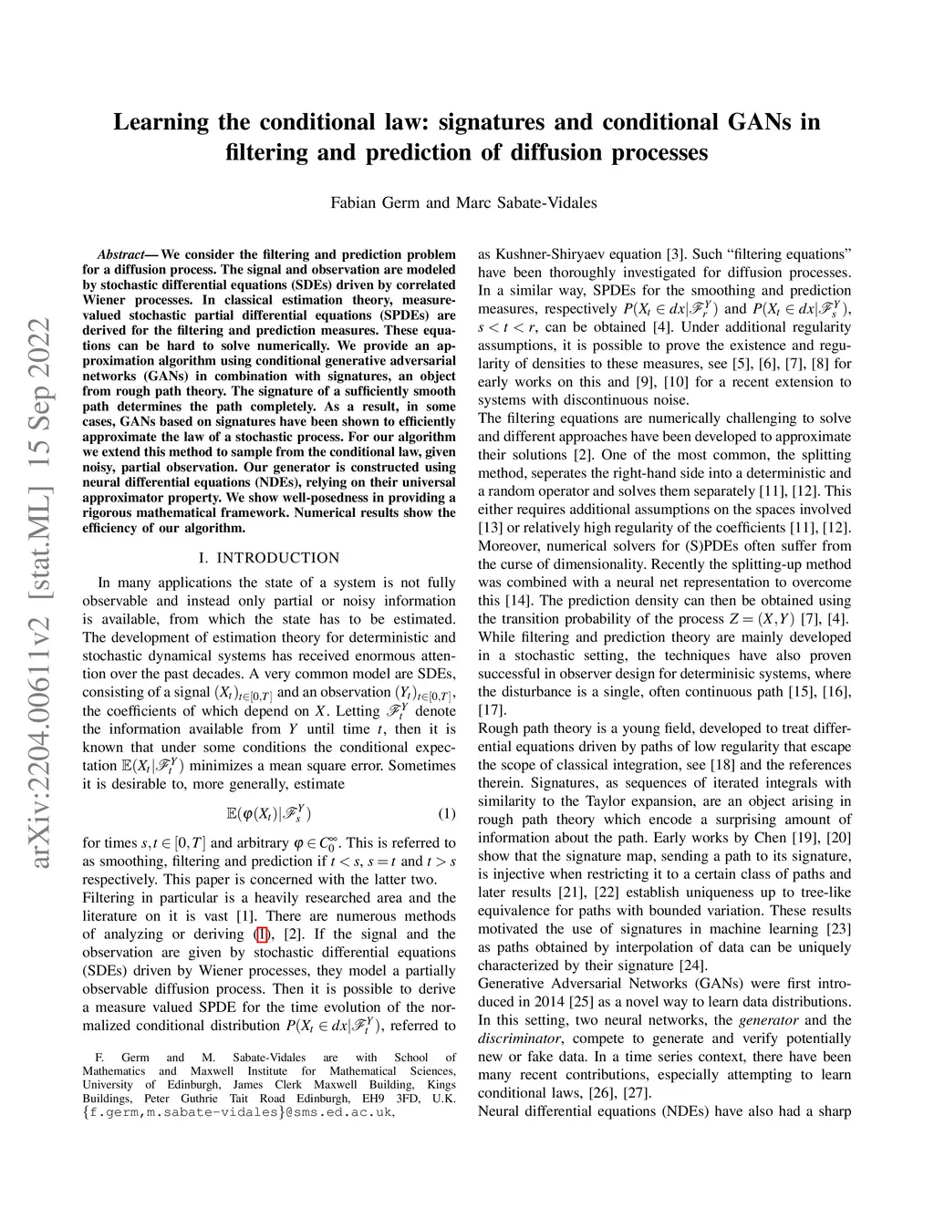 We consider the filtering and prediction problem for a diffusion process. The signal and observation are modeled by stochastic differential equations (SDEs) driven by correlated Wiener processes. In classical estimation theory, measure-valued stochastic partial differential equations (SPDEs) are derived for the filtering and prediction measures. These equations can be hard to solve numerically. We provide an approximation algorithm using conditional generative adversarial networks (GANs) in combination with signatures, an object from rough path theory. The signature of a sufficiently smooth path determines the path completely. As a result, in some cases, GANs based on signatures have been shown to efficiently approximate the law of a stochastic process. For our algorithm we extend this method to sample from the conditional law, given noisy, partial observation. Our generator is constructed using neural differential equations (NDEs), relying on their universal approximator property. We show well-posedness in providing a rigorous mathematical framework. Numerical results show the efficiency of our algorithm.