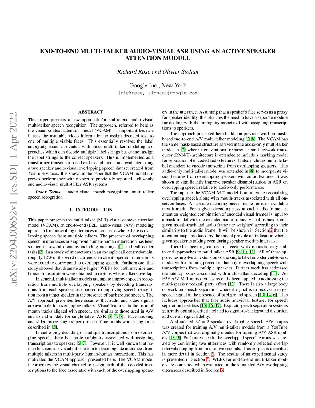 This paper presents a new approach for end-to-end audio-visual multi-talker speech recognition. The approach, referred to here as the visual context attention model (VCAM), is important because it uses the available video information to assign decoded text to one of multiple visible faces. This essentially resolves the label ambiguity issue associated with most multi-talker modeling approaches which can decode multiple label strings but cannot assign the label strings to the correct speakers. This is implemented as a transformer-transducer based end-to-end model and evaluated using a two speaker audio-visual overlapping speech dataset created from YouTube videos. It is shown in the paper that the VCAM model improves performance with respect to previously reported audio-only and audio-visual multi-talker ASR systems.