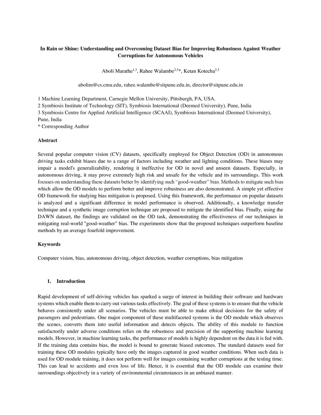 Several popular computer vision (CV) datasets, specifically employed for Object Detection (OD) in autonomous driving tasks exhibit biases due to a range of factors including weather and lighting conditions. These biases may impair a model's generalizability, rendering it ineffective for OD in novel and unseen datasets. Especially, in autonomous driving, it may prove extremely high risk and unsafe for the vehicle and its surroundings. This work focuses on understanding these datasets better by identifying such "good-weather" bias. Methods to mitigate such bias which allows the OD models to perform better and improve the robustness are also demonstrated. A simple yet effective OD framework for studying bias mitigation is proposed. Using this framework, the performance on popular datasets is analyzed and a significant difference in model performance is observed. Additionally, a knowledge transfer technique and a synthetic image corruption technique are proposed to mitigate the identified bias. Finally, using the DAWN dataset, the findings are validated on the OD task, demonstrating the effectiveness of our techniques in mitigating real-world "good-weather" bias. The experiments show that the proposed techniques outperform baseline methods by averaged fourfold improvement.