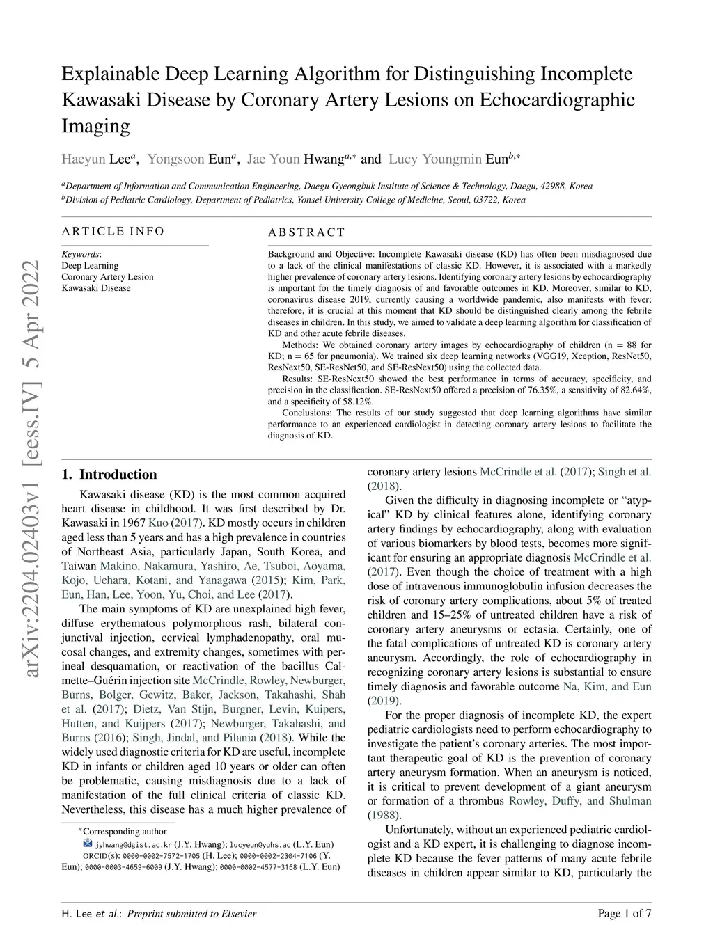 Background and Objective: Incomplete Kawasaki disease (KD) has often been misdiagnosed due to a lack of the clinical manifestations of classic KD. However, it is associated with a markedly higher prevalence of coronary artery lesions. Identifying coronary artery lesions by echocardiography is important for the timely diagnosis of and favorable outcomes in KD. Moreover, similar to KD, coronavirus disease 2019, currently causing a worldwide pandemic, also manifests with fever; therefore, it is crucial at this moment that KD should be distinguished clearly among the febrile diseases in children. In this study, we aimed to validate a deep learning algorithm for classification of KD and other acute febrile diseases. Methods: We obtained coronary artery images by echocardiography of children (n = 88 for KD; n = 65 for pneumonia). We trained six deep learning networks (VGG19, Xception, ResNet50, ResNext50, SE-ResNet50, and SE-ResNext50) using the collected data. Results: SE-ResNext50 showed the best performance in terms of accuracy, specificity, and precision in the classification. SE-ResNext50 offered a precision of 76.35%, a sensitivity of 82.64%, and a specificity of 58.12%. Conclusions: The results of our study suggested that deep learning algorithms have similar performance to an experienced cardiologist in detecting coronary artery lesions to facilitate the diagnosis of KD.