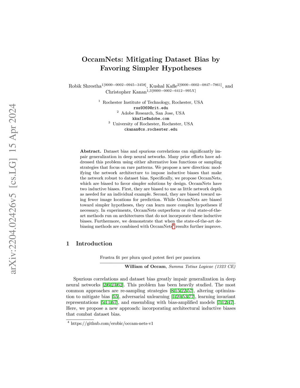 Dataset bias and spurious correlations can significantly impair generalization in deep neural networks. Many prior efforts have addressed this problem using either alternative loss functions or sampling strategies that focus on rare patterns. We propose a new direction: modifying the network architecture to impose inductive biases that make the network robust to dataset bias. Specifically, we propose OccamNets, which are biased to favor simpler solutions by design. OccamNets have two inductive biases. First, they are biased to use as little network depth as needed for an individual example. Second, they are biased toward using fewer image locations for prediction. While OccamNets are biased toward simpler hypotheses, they can learn more complex hypotheses if necessary. In experiments, OccamNets outperform or rival state-of-the-art methods run on architectures that do not incorporate these inductive biases. Furthermore, we demonstrate that when the state-of-the-art debiasing methods are combined with OccamNets results further improve.