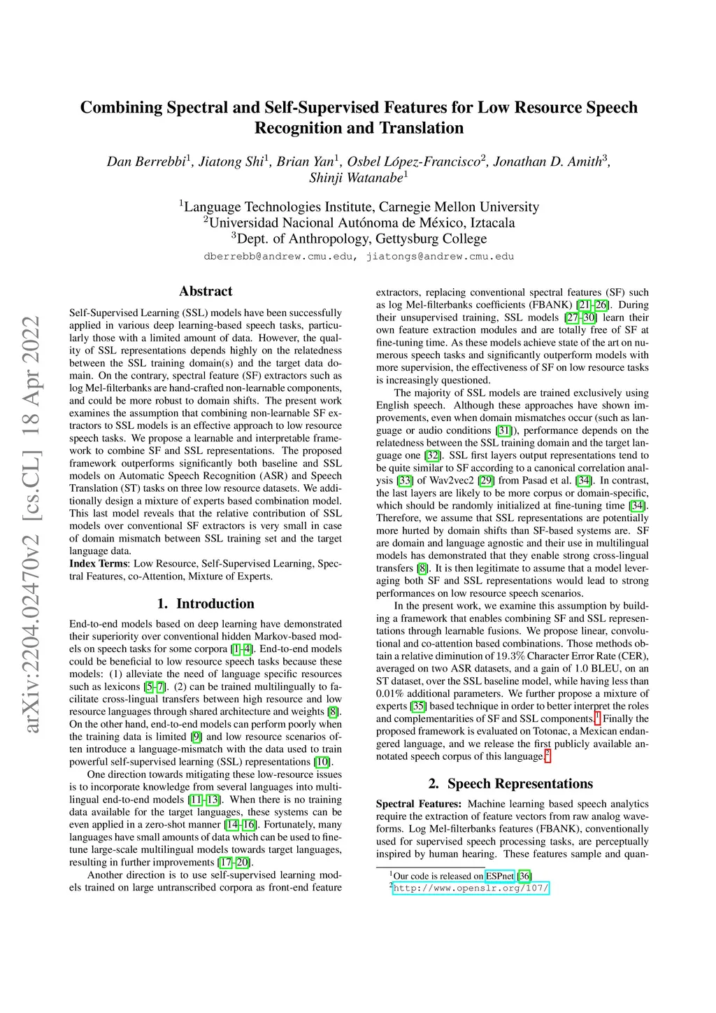Combining Spectral and Self-Supervised Features for Low Resource Speech