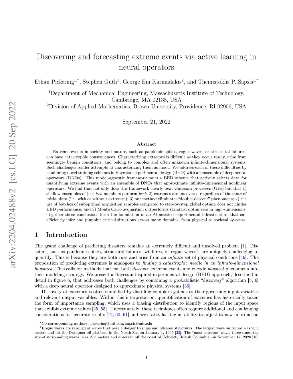 Extreme events in society and nature, such as pandemic spikes, rogue waves, or structural failures, can have catastrophic consequences. Characterizing extremes is difficult as they occur rarely, arise from seemingly benign conditions, and belong to complex and often unknown infinite-dimensional systems. Such challenges render attempts at characterizing them as moot. We address each of these difficulties by combining novel training schemes in Bayesian experimental design (BED) with an ensemble of deep neural operators (DNOs). This model-agnostic framework pairs a BED scheme that actively selects data for quantifying extreme events with an ensemble of DNOs that approximate infinite-dimensional nonlinear operators. We find that not only does this framework clearly beat Gaussian processes (GPs) but that 1) shallow ensembles of just two members perform best; 2) extremes are uncovered regardless of the state of initial data (i.e. with or without extremes); 3) our method eliminates "double-descent" phenomena; 4) the use of batches of suboptimal acquisition points compared to step-by-step global optima does not hinder BED performance; and 5) Monte Carlo acquisition outperforms standard optimizers in high-dimensions. Together these conclusions form the foundation of an AI-assisted experimental infrastructure that can efficiently infer and pinpoint critical situations across many domains, from physical to societal systems.