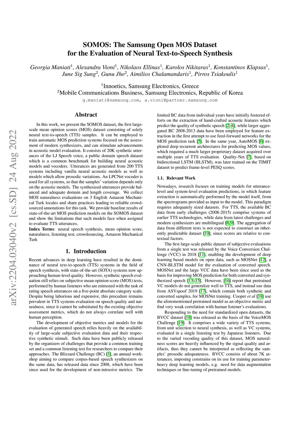SOMOS: The Samsung Open MOS Dataset for the Evaluation of Neural