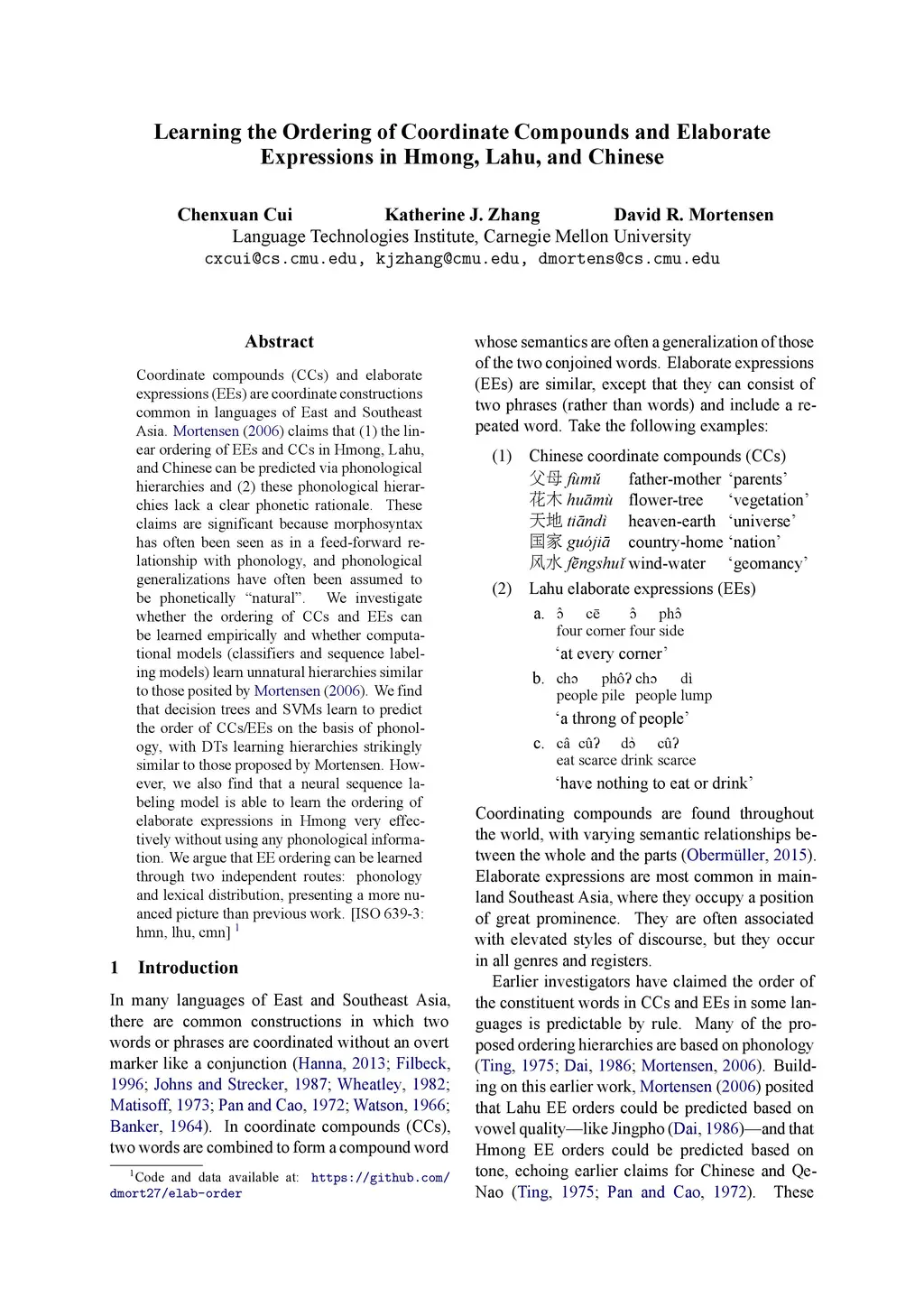 Coordinate compounds (CCs) and elaborate expressions (EEs) are coordinate constructions common in languages of East and Southeast Asia. Mortensen (2006) claims that (1) the linear ordering of EEs and CCs in Hmong, Lahu, and Chinese can be predicted via phonological hierarchies and (2) these phonological hierarchies lack a clear phonetic rationale. These claims are significant because morphosyntax has often been seen as in a feed-forward relationship with phonology, and phonological generalizations have often been assumed to be phonetically "natural". We investigate whether the ordering of CCs and EEs can be learned empirically and whether computational models (classifiers and sequence labeling models) learn unnatural hierarchies similar to those posited by Mortensen (2006). We find that decision trees and SVMs learn to predict the order of CCs/EEs on the basis of phonology, with DTs learning hierarchies strikingly similar to those proposed by Mortensen. However, we also find that a neural sequence labeling model is able to learn the ordering of elaborate expressions in Hmong very effectively without using any phonological information. We argue that EE ordering can be learned through two independent routes: phonology and lexical distribution, presenting a more nuanced picture than previous work. [ISO 639-3:hmn, lhu, cmn]