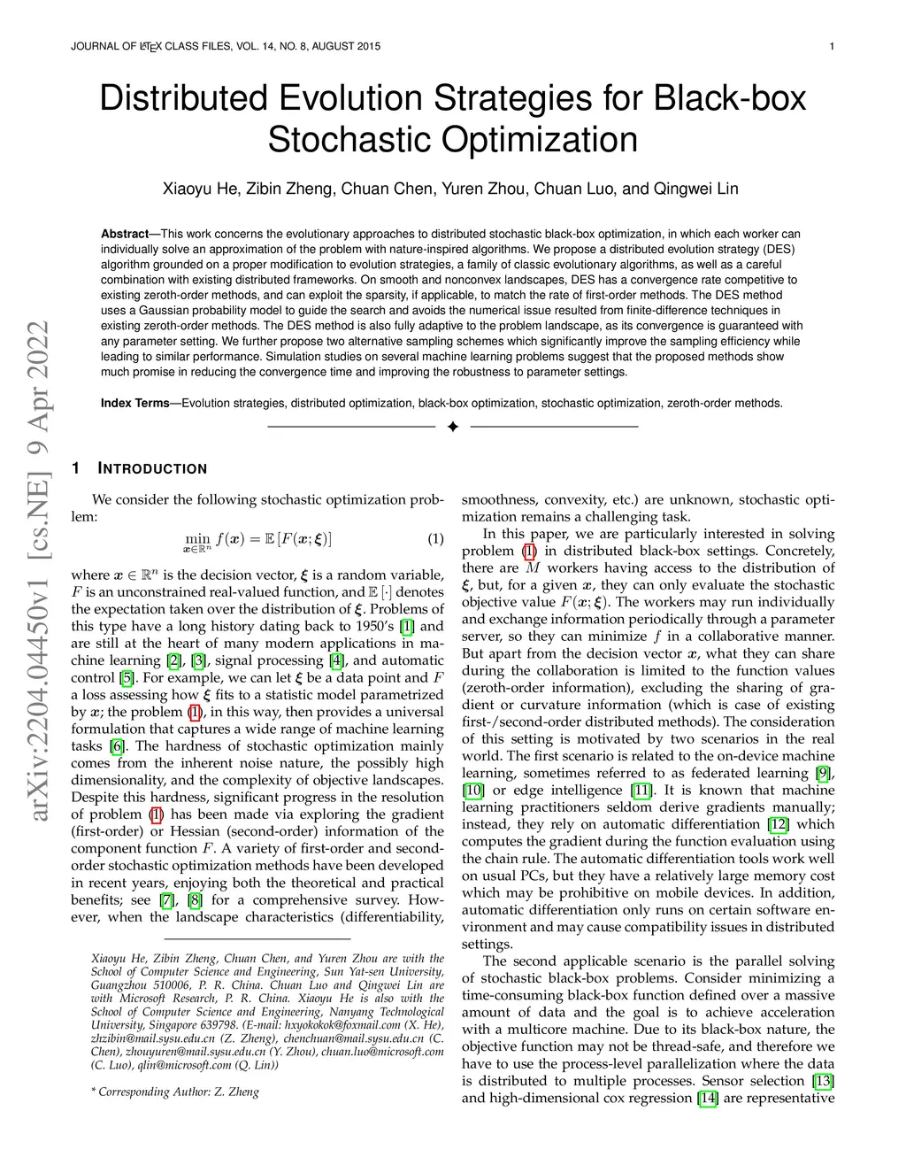 This work concerns the evolutionary approaches to distributed stochastic black-box optimization, in which each worker can individually solve an approximation of the problem with nature-inspired algorithms. We propose a distributed evolution strategy (DES) algorithm grounded on a proper modification to evolution strategies, a family of classic evolutionary algorithms, as well as a careful combination with existing distributed frameworks. On smooth and nonconvex landscapes, DES has a convergence rate competitive to existing zeroth-order methods, and can exploit the sparsity, if applicable, to match the rate of first-order methods. The DES method uses a Gaussian probability model to guide the search and avoids the numerical issue resulted from finite-difference techniques in existing zeroth-order methods. The DES method is also fully adaptive to the problem landscape, as its convergence is guaranteed with any parameter setting. We further propose two alternative sampling schemes which significantly improve the sampling efficiency while leading to similar performance. Simulation studies on several machine learning problems suggest that the proposed methods show much promise in reducing the convergence time and improving the robustness to parameter settings.