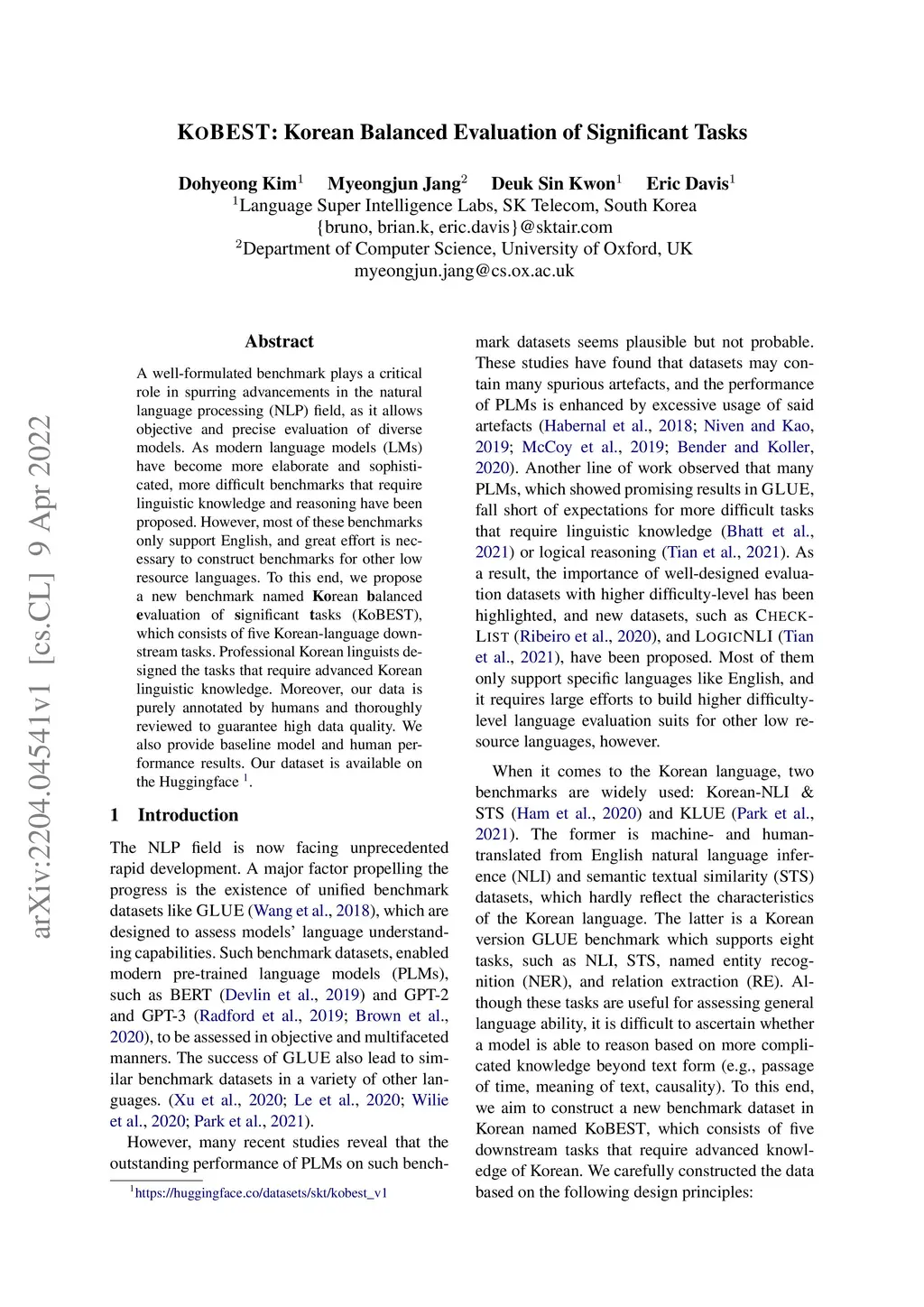 A well-formulated benchmark plays a critical role in spurring advancements in the natural language processing (NLP) field, as it allows objective and precise evaluation of diverse models. As modern language models (LMs) have become more elaborate and sophisticated, more difficult benchmarks that require linguistic knowledge and reasoning have been proposed. However, most of these benchmarks only support English, and great effort is necessary to construct benchmarks for other low resource languages. To this end, we propose a new benchmark named Korean balanced evaluation of significant tasks (KoBEST), which consists of five Korean-language downstream tasks. Professional Korean linguists designed the tasks that require advanced Korean linguistic knowledge. Moreover, our data is purely annotated by humans and thoroughly reviewed to guarantee high data quality. We also provide baseline models and human performance results. Our dataset is available on the Huggingface.