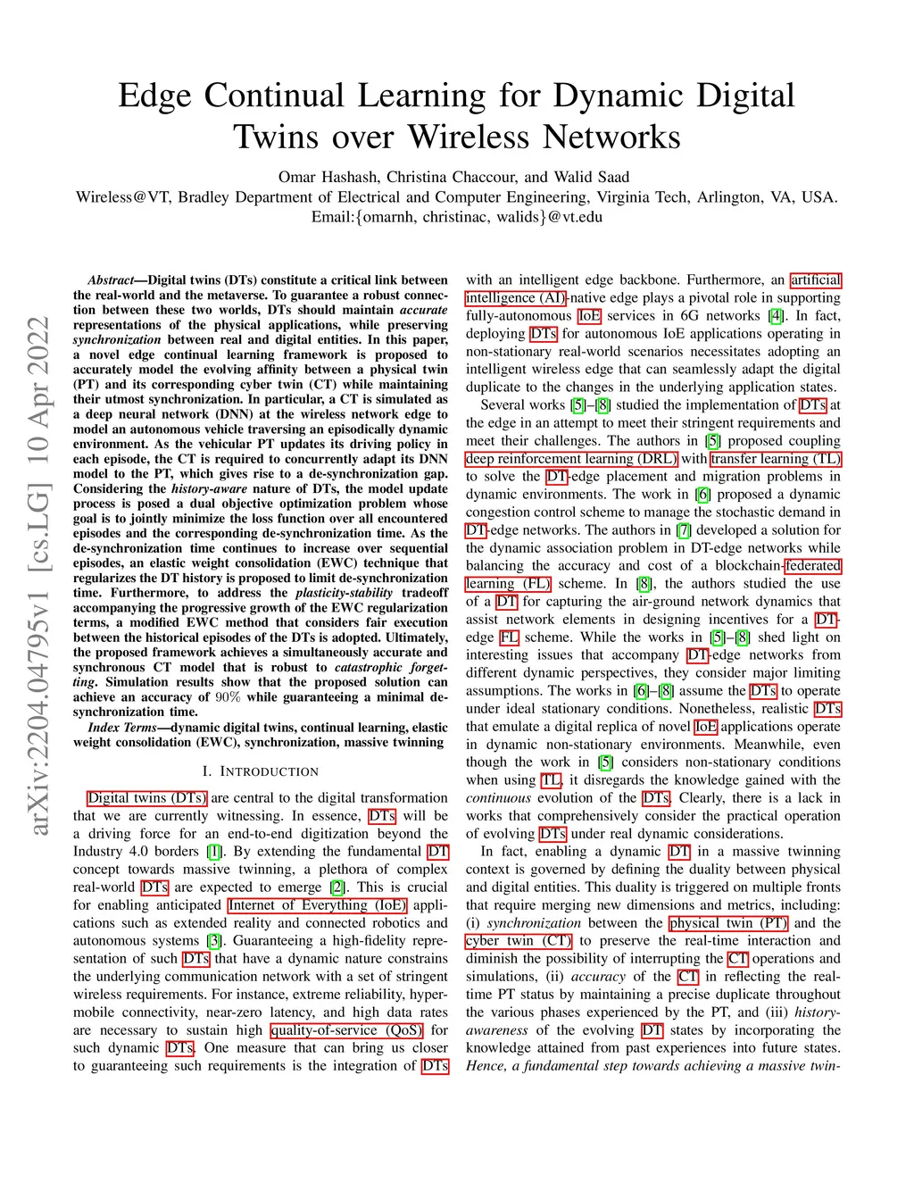 Digital twins (DTs) constitute a critical link between the real-world and the metaverse. To guarantee a robust connection between these two worlds, DTs should maintain accurate representations of the physical applications, while preserving synchronization between real and digital entities. In this paper, a novel edge continual learning framework is proposed to accurately model the evolving affinity between a physical twin (PT) and its corresponding cyber twin (CT) while maintaining their utmost synchronization. In particular, a CT is simulated as a deep neural network (DNN) at the wireless network edge to model an autonomous vehicle traversing an episodically dynamic environment. As the vehicular PT updates its driving policy in each episode, the CT is required to concurrently adapt its DNN model to the PT, which gives rise to a de-synchronization gap. Considering the history-aware nature of DTs, the model update process is posed a dual objective optimization problem whose goal is to jointly minimize the loss function over all encountered episodes and the corresponding de-synchronization time. As the de-synchronization time continues to increase over sequential episodes, an elastic weight consolidation (EWC) technique that regularizes the DT history is proposed to limit de-synchronization time. Furthermore, to address the plasticity-stability tradeoff accompanying the progressive growth of the EWC regularization terms, a modified EWC method that considers fair execution between the historical episodes of the DTs is adopted. Ultimately, the proposed framework achieves a simultaneously accurate and synchronous CT model that is robust to catastrophic forgetting. Simulation results show that the proposed solution can achieve an accuracy of 90 % while guaranteeing a minimal desynchronization time.