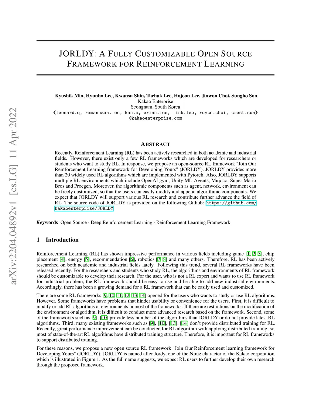 Recently, Reinforcement Learning (RL) has been actively researched in both academic and industrial fields. However, there exist only a few RL frameworks which are developed for researchers or students who want to study RL. In response, we propose an open-source RL framework "Join Our Reinforcement Learning framework for Developing Yours" (JORLDY). JORLDY provides more than 20 widely used RL algorithms which are implemented with Pytorch. Also, JORLDY supports multiple RL environments which include OpenAI gym, Unity ML-Agents, Mujoco, Super Mario Bros and Procgen. Moreover, the algorithmic components such as agent, network, environment can be freely customized, so that the users can easily modify and append algorithmic components. We expect that JORLDY will support various RL research and contribute further advance the field of RL. The source code of JORLDY is provided on the following Github: https://github.com/kakaoenterprise/JORLDY