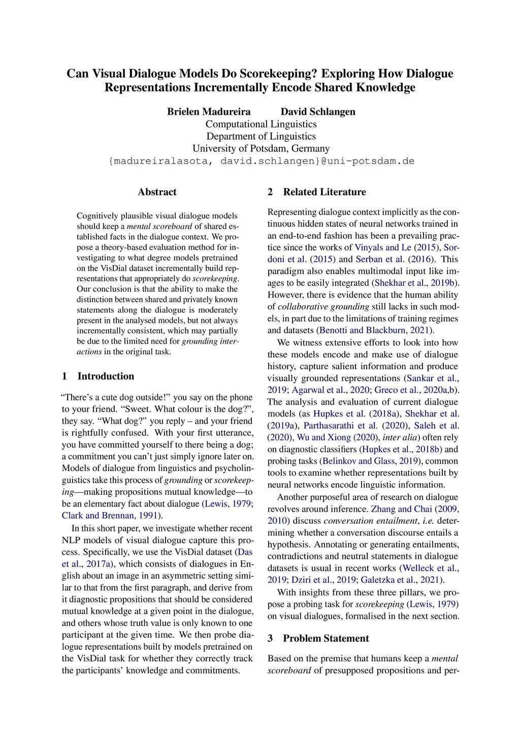 Cognitively plausible visual dialogue models should keep a mental scoreboard of shared established facts in the dialogue context. We propose a theory-based evaluation method for investigating to what degree models pretrained on the VisDial dataset incrementally build representations that appropriately do scorekeeping. Our conclusion is that the ability to make the distinction between shared and privately known statements along the dialogue is moderately present in the analysed models, but not always incrementally consistent, which may partially be due to the limited need for grounding interactions in the original task.