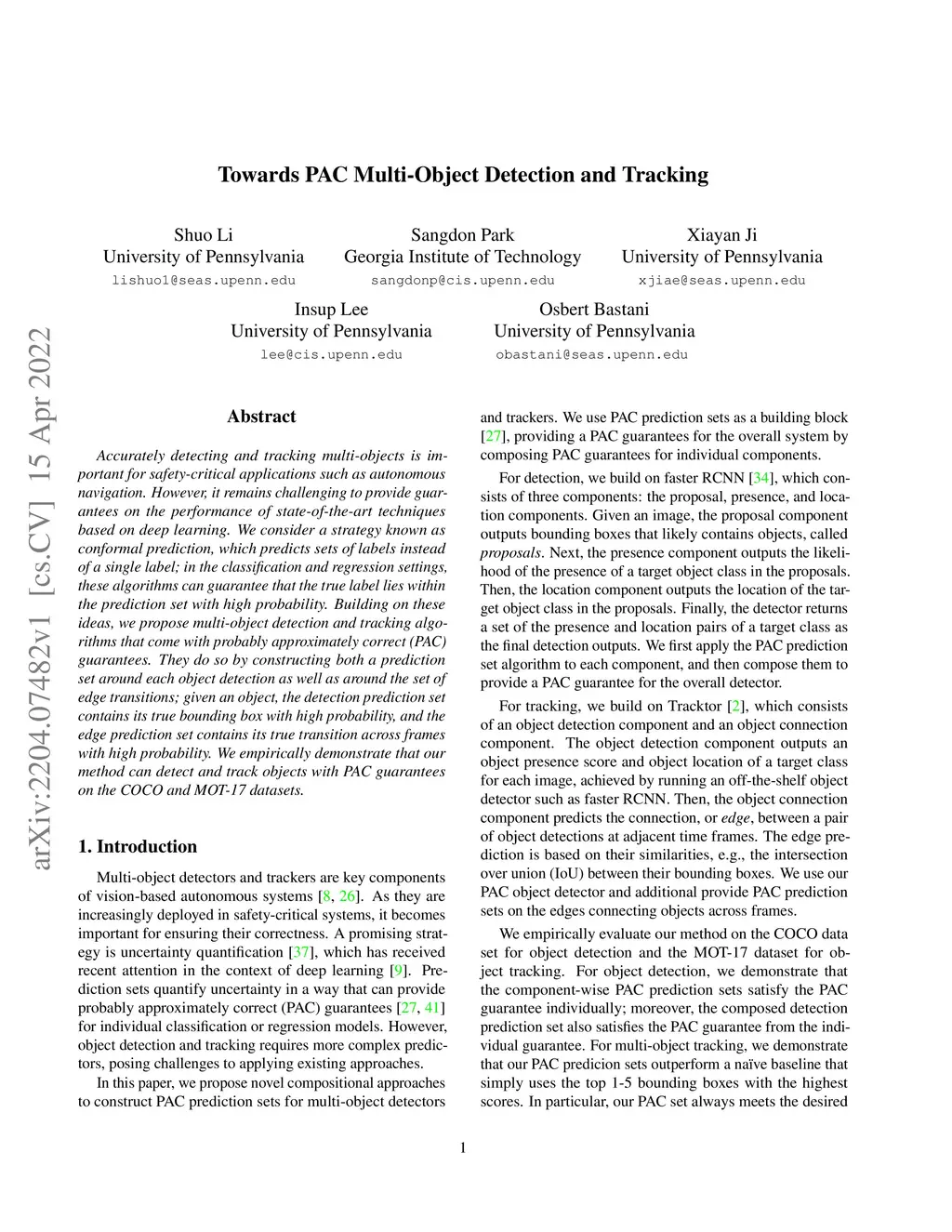 Accurately detecting and tracking multi-objects is important for safety-critical applications such as autonomous navigation. However, it remains challenging to provide guarantees on the performance of state-of-the-art techniques based on deep learning. We consider a strategy known as conformal prediction, which predicts sets of labels instead of a single label; in the classification and regression settings, these algorithms can guarantee that the true label lies within the prediction set with high probability. Building on these ideas, we propose multi-object detection and tracking algorithms that come with probably approximately correct (PAC) guarantees. They do so by constructing both a prediction set around each object detection as well as around the set of edge transitions; given an object, the detection prediction set contains its true bounding box with high probability, and the edge prediction set contains its true transition across frames with high probability. We empirically demonstrate that our method can detect and track objects with PAC guarantees on the COCO and MOT-17 datasets.