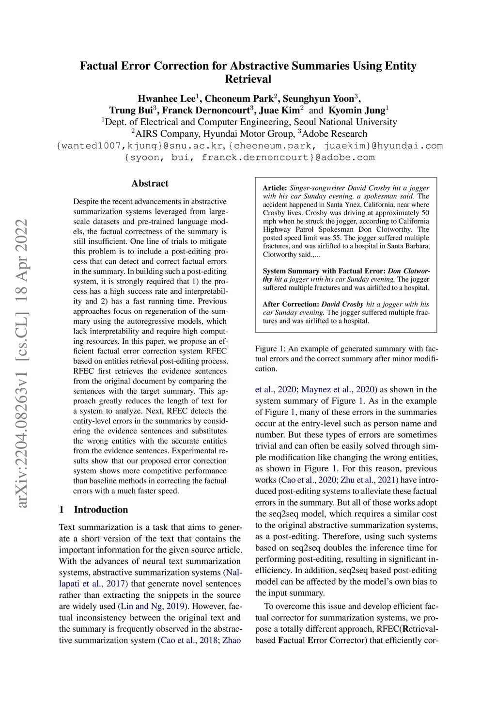 Despite the recent advancements in abstractive summarization systems leveraged from large-scale datasets and pre-trained language models, the factual correctness of the summary is still insufficient. One line of trials to mitigate this problem is to include a post-editing process that can detect and correct factual errors in the summary. In building such a post-editing system, it is strongly required that 1) the process has a high success rate and interpretability and 2) has a fast running time. Previous approaches focus on regeneration of the summary using the autoregressive models, which lack interpretability and require high computing resources. In this paper, we propose an efficient factual error correction system RFEC based on entities retrieval post-editing process. RFEC first retrieves the evidence sentences from the original document by comparing the sentences with the target summary. This approach greatly reduces the length of text for a system to analyze. Next, RFEC detects the entity-level errors in the summaries by considering the evidence sentences and substitutes the wrong entities with the accurate entities from the evidence sentences. Experimental results show that our proposed error correction system shows more competitive performance than baseline methods in correcting the factual errors with a much faster speed.
