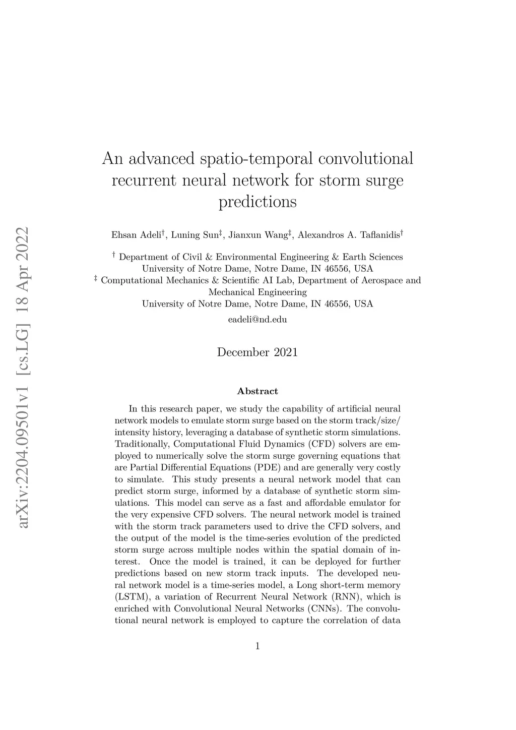 In this research paper, we study the capability of artificial neural network models to emulate storm surge based on the storm track/size/intensity history, leveraging a database of synthetic storm simulations. Traditionally, Computational Fluid Dynamics solvers are employed to numerically solve the storm surge governing equations that are Partial Differential Equations and are generally very costly to simulate. This study presents a neural network model that can predict storm surge, informed by a database of synthetic storm simulations. This model can serve as a fast and affordable emulator for the very expensive CFD solvers. The neural network model is trained with the storm track parameters used to drive the CFD solvers, and the output of the model is the time-series evolution of the predicted storm surge across multiple nodes within the spatial domain of interest. Once the model is trained, it can be deployed for further predictions based on new storm track inputs. The developed neural network model is a time-series model, a Long short-term memory, a variation of Recurrent Neural Network, which is enriched with Convolutional Neural Networks. The convolutional neural network is employed to capture the correlation of data spatially. Therefore, the temporal and spatial correlations of data are captured by the combination of the mentioned models, the ConvLSTM model. As the problem is a sequence to sequence time-series problem, an encoder-decoder ConvLSTM model is designed. Some other techniques in the process of model training are also employed to enrich the model performance. The results show the proposed convolutional recurrent neural network outperforms the Gaussian Process implementation for the examined synthetic storm database.