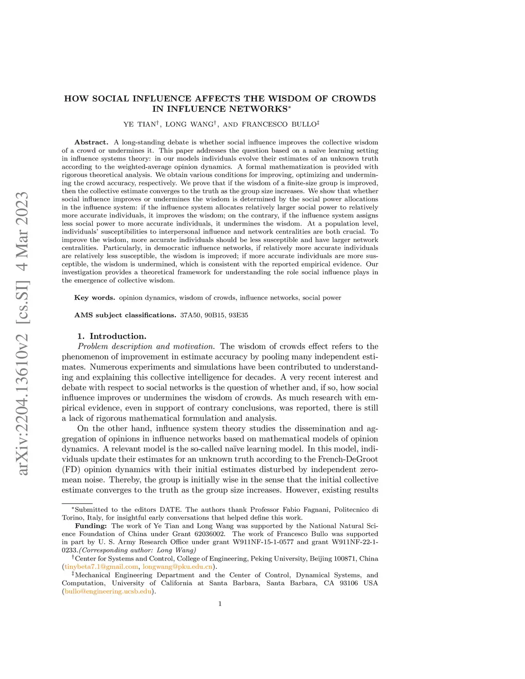 A long-standing debate is whether social influence improves the collective wisdom of a crowd or undermines it. This paper addresses this question based on a naive learning setting in influence systems theory: in our models individuals evolve their estimates of an unknown truth according to the weighted-average opinion dynamics. A formal mathematization is provided with rigorous theoretical analysis. We obtain various conditions for improving, optimizing and undermining the crowd accuracy, respectively. We prove that if the wisdom of finite-size group is improved, then the collective estimate converges to the truth as group size increases, provided individuals' variances are finite. We show that whether social influence improves or undermines the wisdom is determined by the social power allocation of the influence system: if the influence system allocates relatively larger social power to relatively more accurate individuals, it improves the wisdom; on the contrary, if the influence system assigns less social power to more accurate individuals, it undermines the wisdom. At a population level, individuals' susceptibilities to interpersonal influence and network centralities are both crucial. To improve the wisdom, more accurate individuals should be less susceptible and have larger network centralities. Particularly, in democratic influence networks, if relatively more accurate individuals are relatively less susceptible, the wisdom is improved; if more accurate individuals are more susceptible, the wisdom is undermined, which is consistent with the reported empirical evidence. Our investigation provides a theoretical framework for understanding the role social influence plays in the emergence of collective wisdom.