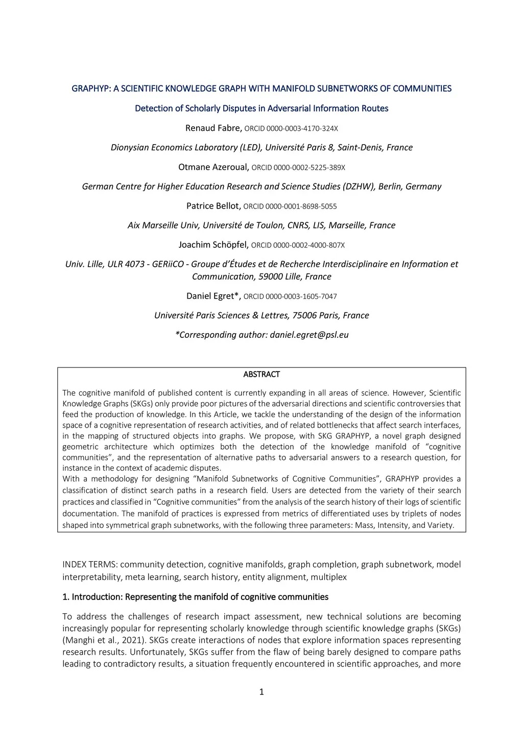 The cognitive manifold of published content is currently expanding in all areas of science. However, Scientific Knowledge Graphs (SKGs) only provide poor pictures of the adversarial directions and scientific controversies that feed the production of knowledge. In this Article, we tackle the understanding of the design of the information space of a cognitive representation of research activities, and of related bottlenecks that affect search interfaces, in the mapping of structured objects into graphs. We propose, with SKG GRAPHYP, a novel graph designed geometric architecture which optimizes both the detection of the knowledge manifold of "cognitive communities", and the representation of alternative paths to adversarial answers to a research question, for instance in the context of academic disputes. With a methodology for designing "Manifold Subnetworks of Cognitive Communities", GRAPHYP provides a classification of distinct search paths in a research field. Users are detected from the variety of their search practices and classified in "Cognitive communities" from the analysis of the search history of their logs of scientific documentation. The manifold of practices is expressed from metrics of differentiated uses by triplets of nodes shaped into symmetrical graph subnetworks, with the following three parameters: Mass, Intensity, and Variety.