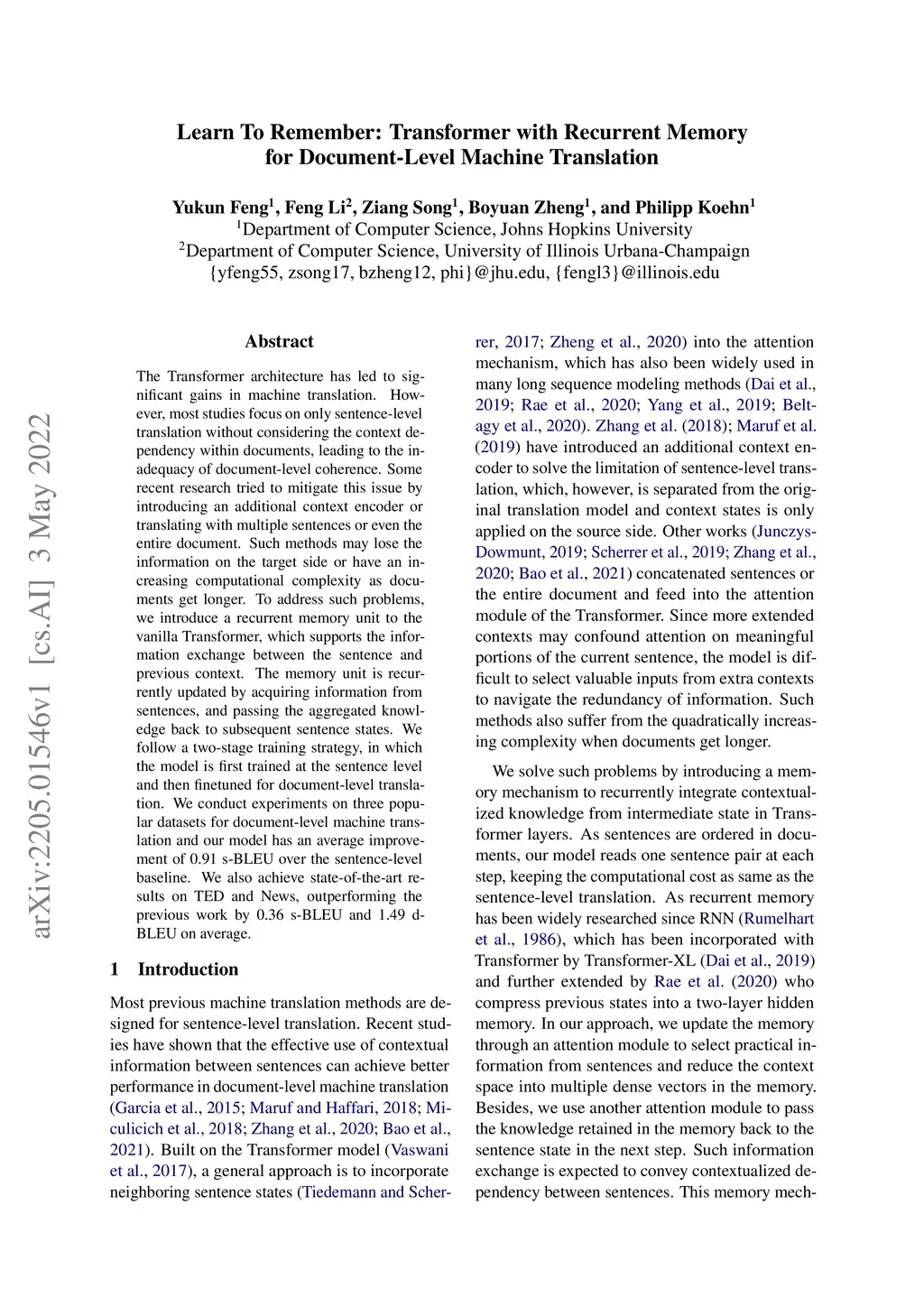 Learn To Remember: Transformer with Recurrent Memory for Document-Level