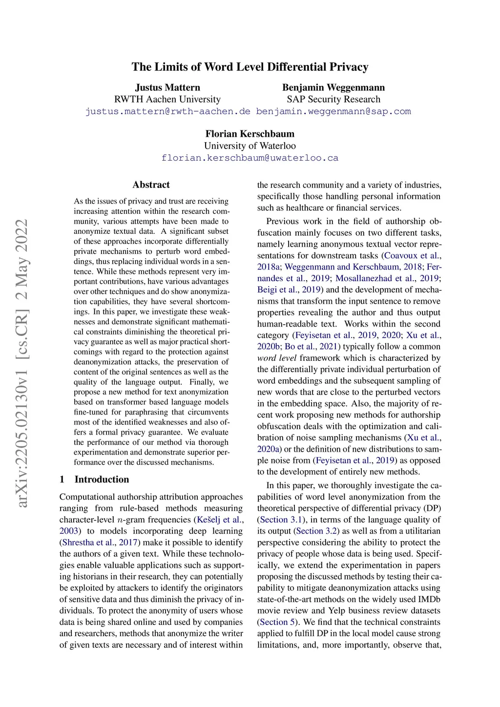 As the issues of privacy and trust are receiving increasing attention within the research community, various attempts have been made to anonymize textual data. A significant subset of these approaches incorporate differentially private mechanisms to perturb word embeddings, thus replacing individual words in a sentence. While these methods represent very important contributions, have various advantages over other techniques and do show anonymization capabilities, they have several shortcomings. In this paper, we investigate these weaknesses and demonstrate significant mathematical constraints diminishing the theoretical privacy guarantee as well as major practical shortcomings with regard to the protection against deanonymization attacks, the preservation of content of the original sentences as well as the quality of the language output. Finally, we propose a new method for text anonymization based on transformer based language models fine-tuned for paraphrasing that circumvents most of the identified weaknesses and also offers a formal privacy guarantee. We evaluate the performance of our method via thorough experimentation and demonstrate superior performance over the discussed mechanisms.