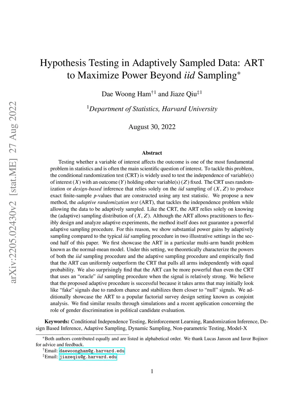Testing whether a variable of interest affects the outcome is one of the most fundamental problem in statistics and is often the main scientific question of interest. To tackle this problem, the conditional randomization test (CRT) is widely used to test the independence of variable(s) of interest (X) with an outcome (Y) holding other variable(s) (Z) fixed. The CRT uses randomization or design-based inference that relies solely on the iid sampling of (X,Z) to produce exact finite-sample p-values that are constructed using any test statistic. We propose a new method, the adaptive randomization test (ART), that tackles the independence problem while allowing the data to be adaptively sampled. We first showcase the ART in a particular multi-arm bandit problem known as the normal-mean model. Under this setting, we theoretically characterize the powers of both the iid sampling procedure and the adaptive sampling procedure and empirically find that the ART can uniformly outperform the CRT that pulls all arms independently with equal probability. We also surprisingly find that the ART can be more powerful than even the CRT that uses an oracle iid sampling procedure when the signal is relatively strong. We believe that the proposed adaptive procedure is successful because it takes arms that may initially look like "fake" signals due to random chance and stabilizes them closer to "null" signals. We additionally showcase the ART to a popular factorial survey design setting known as conjoint analysis. We find similar results through simulations and a recent application concerning the role of gender discrimination in political candidate evaluation.