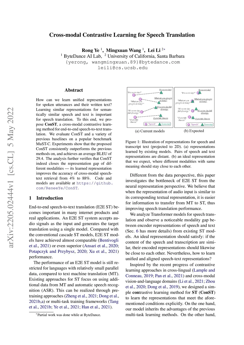 How can we learn unified representations for spoken utterances and their written text? Learning similar representations for semantically similar speech and text is important for speech translation. To this end, we propose ConST, a cross-modal contrastive learning method for end-to-end speech-to-text translation. We evaluate ConST and a variety of previous baselines on a popular benchmark MuST-C. Experiments show that the proposed ConST consistently outperforms the previous methods on, and achieves an average BLEU of 29.4. The analysis further verifies that ConST indeed closes the representation gap of different modalities -- its learned representation improves the accuracy of cross-modal speech-text retrieval from 4% to 88%. Code and models are available at https://github.com/ReneeYe/ConST.