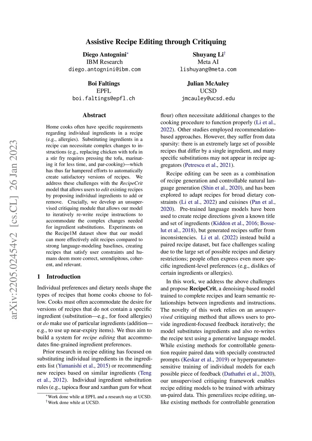 Assistive Recipe Editing through Critiquing