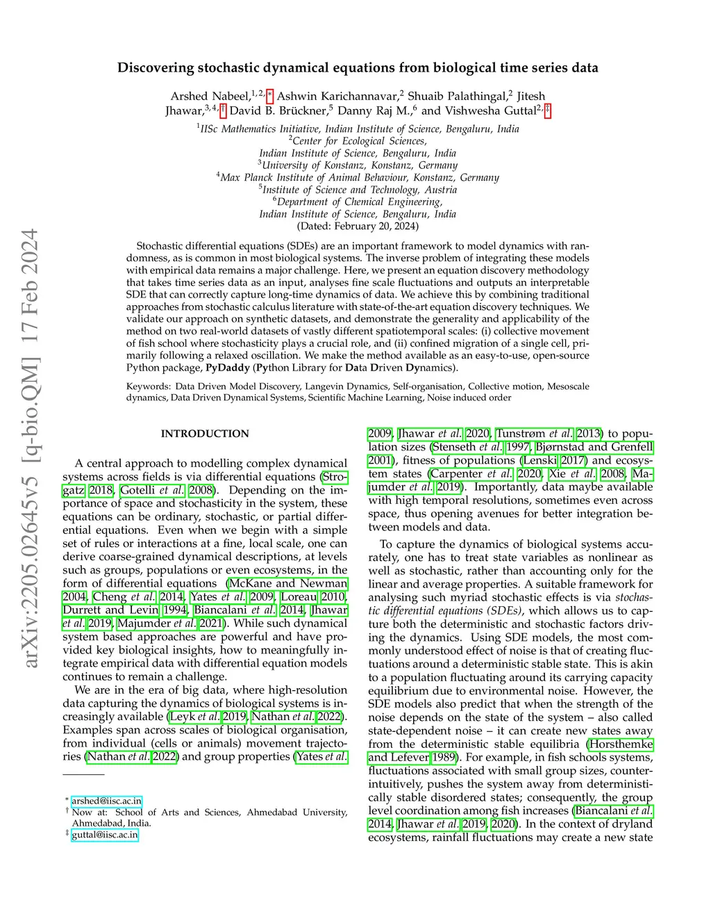 Stochastic differential equations (SDEs) are an important framework to model dynamics with randomness, as is common in most biological systems. The inverse problem of integrating these models with empirical data remains a major challenge. Here, we present a software package, PyDaDDy (Python Library for Data Driven Dynamics) that takes time series data as an input and outputs an interpretable SDE. We achieve this by combining traditional approaches from stochastic calculus literature with state-of-the-art equation discovery techniques. We validate our approach on synthetic datasets, and demonstrate the generality and applicability of the method on two real-world datasets of vastly different spatiotemporal scales: (i) collective movement of fish school where stochasticity plays a crucial role, and (ii) confined migration of a single cell, primarily following a relaxed oscillation. We make the method available as an easy-to-use, open-source Python package, PyDaddy (Python Library for Data Driven Dynamics).