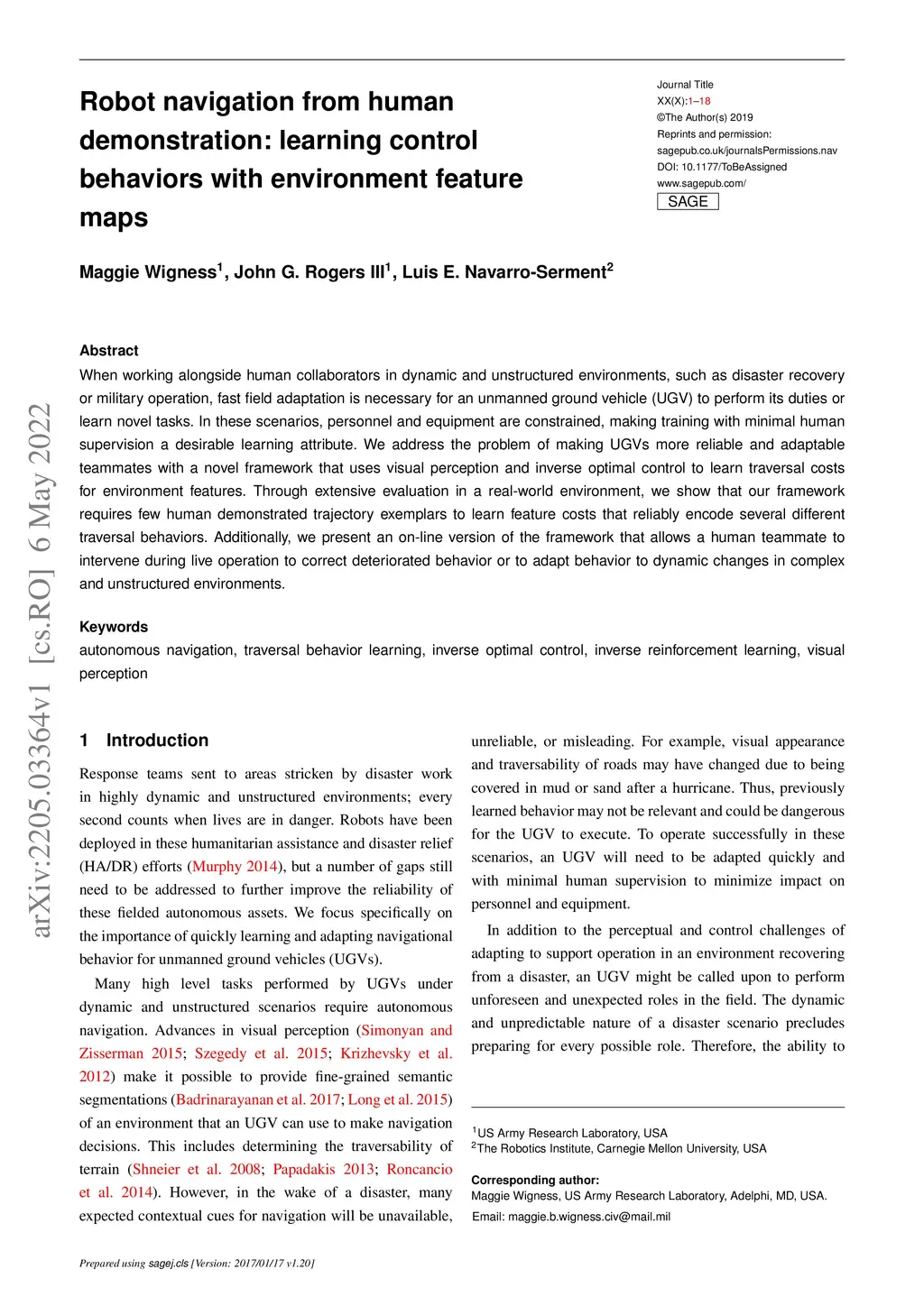 When working alongside human collaborators in dynamic and unstructured environments, such as disaster recovery or military operation, fast field adaptation is necessary for an unmanned ground vehicle (UGV) to perform its duties or learn novel tasks. In these scenarios, personnel and equipment are constrained, making training with minimal human supervision a desirable learning attribute. We address the problem of making UGVs more reliable and adaptable teammates with a novel framework that uses visual perception and inverse optimal control to learn traversal costs for environment features. Through extensive evaluation in a real-world environment, we show that our framework requires few human demonstrated trajectory exemplars to learn feature costs that reliably encode several different traversal behaviors. Additionally, we present an on-line version of the framework that allows a human teammate to intervene during live operation to correct deteriorated behavior or to adapt behavior to dynamic changes in complex and unstructured environments.