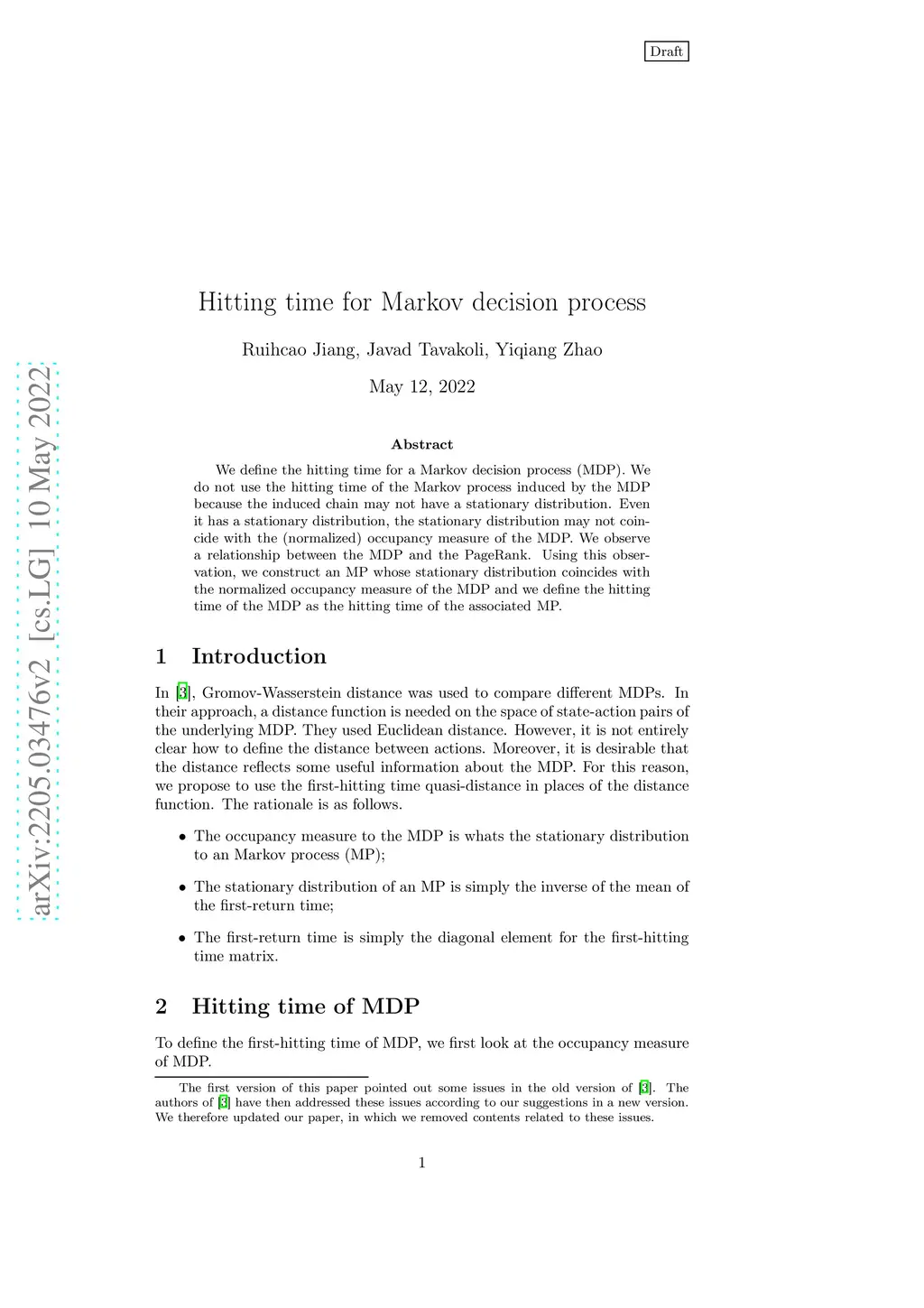 We define the hitting time for a Markov decision process (MDP). We do not use the hitting time of the Markov process induced by the MDP because the induced chain may not have a stationary distribution. Even it has a stationary distribution, the stationary distribution may not coincide with the (normalized) occupancy measure of the MDP. We observe a relationship between the MDP and the PageRank. Using this observation, we construct an MP whose stationary distribution coincides with the normalized occupancy measure of the MDP and we define the hitting time of the MDP as the hitting time of the associated MP.