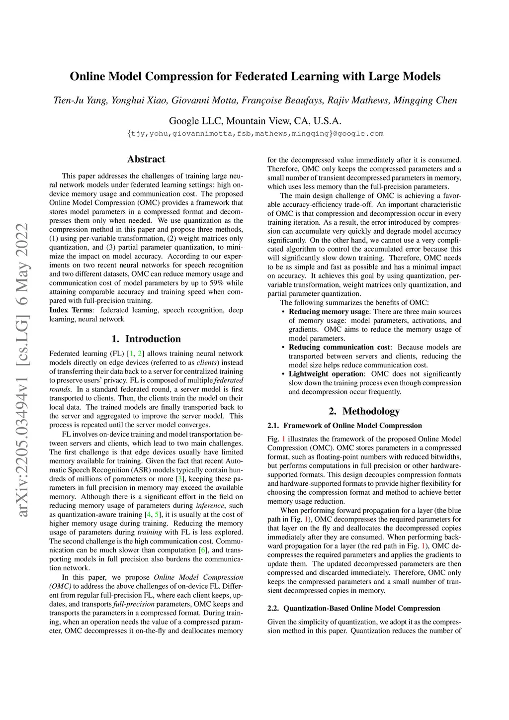 This paper addresses the challenges of training large neural network models under federated learning settings: high on-device memory usage and communication cost. The proposed Online Model Compression (OMC) provides a framework that stores model parameters in a compressed format and decompresses them only when needed. We use quantization as the compression method in this paper and propose three methods, (1) using per-variable transformation, (2) weight matrices only quantization, and (3) partial parameter quantization, to minimize the impact on model accuracy. According to our experiments on two recent neural networks for speech recognition and two different datasets, OMC can reduce memory usage and communication cost of model parameters by up to 59% while attaining comparable accuracy and training speed when compared with full-precision training.